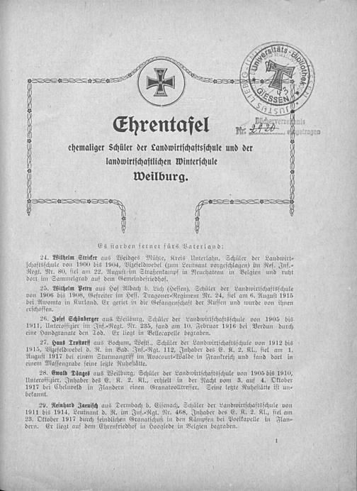 26. Joſef Schönberger aus Weilburg, Schüler der Landwirtſchaftsſchule von 1905 bis 1911, Unteroffizier im Inf.⸗Regt. Nr. 235, fand am 10. Februar 1916 bei Verdun durch eine Handgranate den Tod. Er liegt in Bellecapelle begraben.