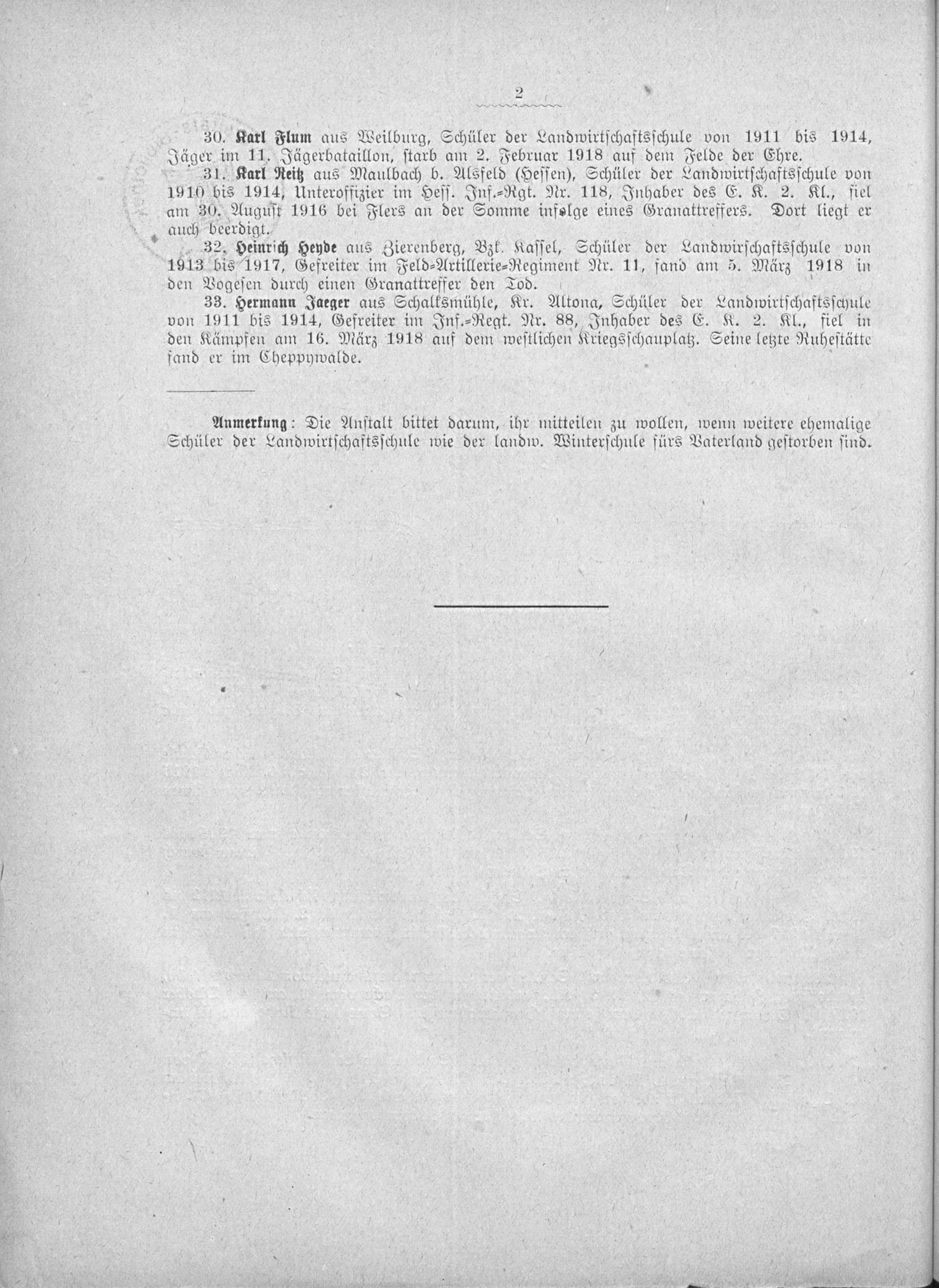 Anmerkung: Die Anſtalt bittet darum, ihr mitteilen zu wollen, wenn weitere ehemalige Schüler der Landwirtſchaftsſchule wie der landw. Winterſchule fürs Vaterland geſtorben ſind.