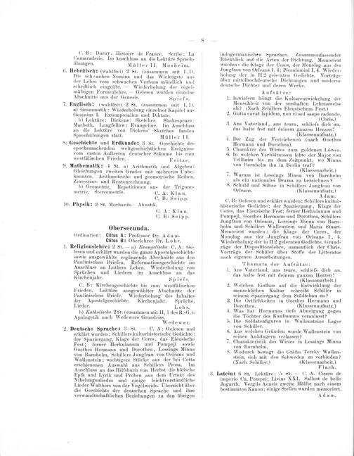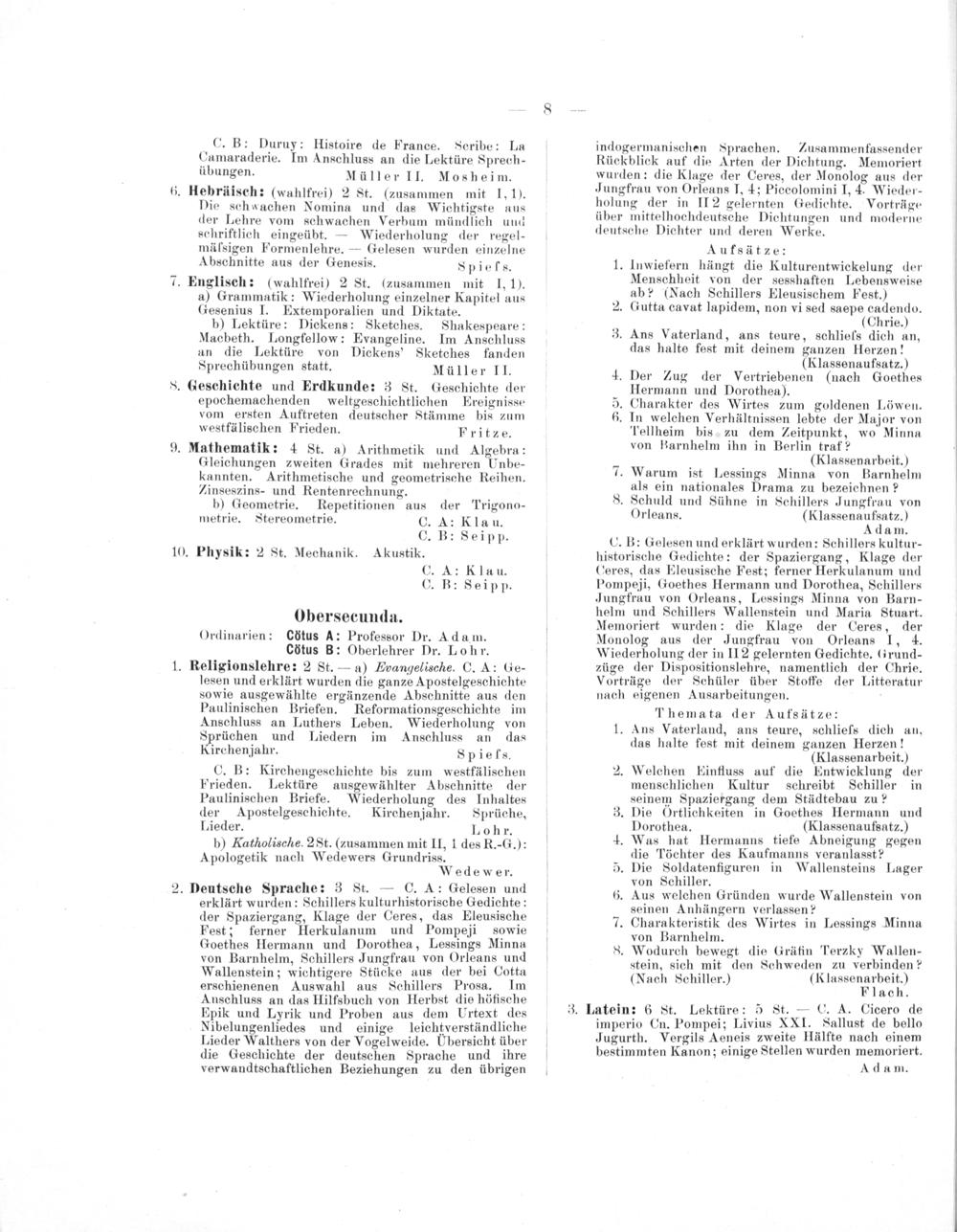 lesen und erklärt wurden die ganze Apostelgeschichte sowie ausgewählte ergänzende Abschnitte aus den Paulinischen Briefen. Reformationsgeschichte im Anschluss an Luthers Leben. Wiederholung von Sprüchen und Liedern im Anschluss an das Kirchenjahr. Spiefs. C. B: Kirchengeschichte bis zum westfälischen Frieden. Lektüre ausgewählter Abschnitte der Paulinischen Briefe. Wiederholung des Inhaltes der Apostelgeschichte. Kirchenjahr. Sprüche, Lieder. Lohr. b) Katholische. 28t.(zusammen mit II, 1 des R.-G.): Apologetik nach Wedewers Grundriss. Wedewer.