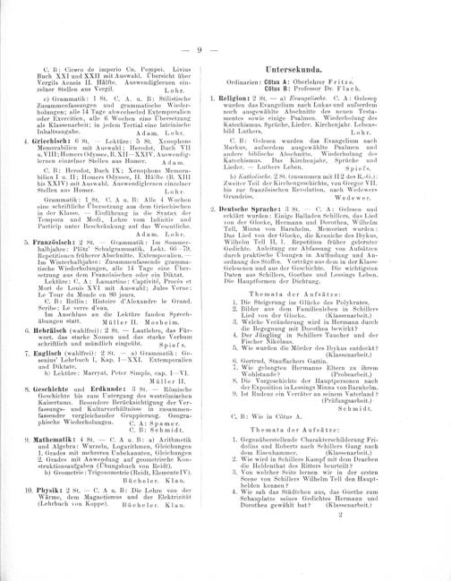 Themata der Aufsätze: 1. Die Steigerung im Glücke des Polykrates. 2. Bilder aus dem Familienleben in Schillers Lied von der Glocke.(Klassenarbeit.) 3. Welche Veränderung wird in Hermann durch die Begegnung mit Dorothea bewirkt? 4. Der Jüngling in Schillers Taucher und der Fischer Nikolaus. 5. Wie wurden die Mörder des Ibykus entdeckt? (Klassenarbeit.) 6. Gertrud, Stauffachers Gattin. .Wie gelangten Hermanns Eltern zu ihrem Wohlstande?(Probearbeit.) 8. Die Vorgeschichte der Hauptpersonen nach der Exposition in Lessings Minna von Barnhelm. 9. Ist Rudenz ein Verräter an seinem Vaterland? (Prüfungsarbeit.) Schmidt. C. B: Wie in Cötus A.