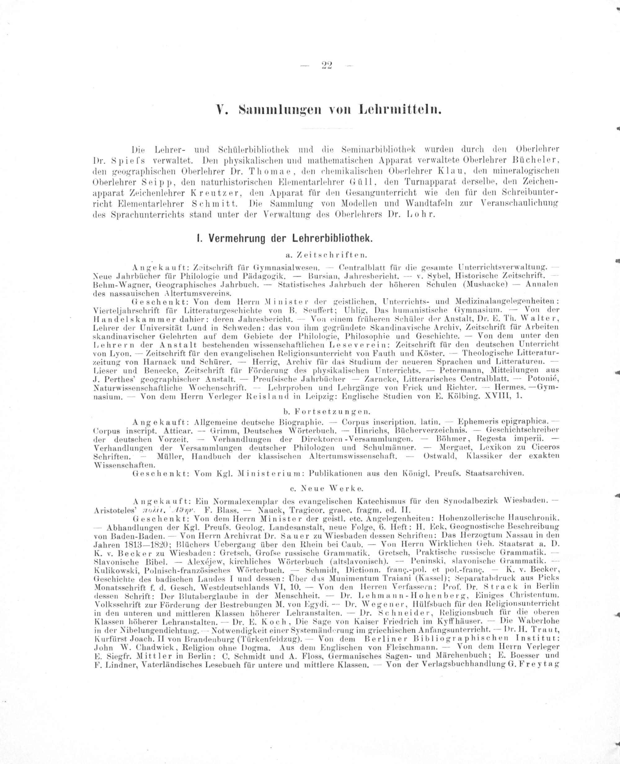 Angekauft: Zeitschrift für Gymnasialwesen.— Centralblatt für die gesamte Unterrichtsverwaltung. Neue Jahrbücher für Philologie und Pädagogik.— Bursian, Jahresbericht.— v. Sybel, Historische Zeitschrift. Behm-Wagner, Geographisches Jahrbuch.— Statistisches Jahrbuch der höheren Schulen(Mushacke)— Annalen des nassauischen Altertumsvereins.