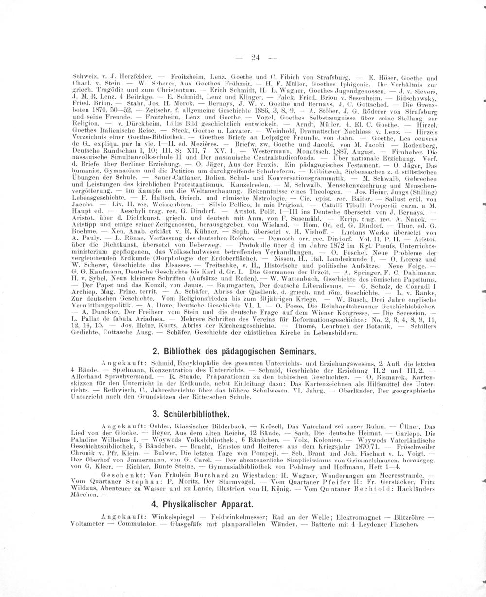 Schweiz, v. J. Herzfelder.— Froitzheim, Lenz, Goethe und C. Fibich von Stralsburg.— E. Höser, Goethe und Charl. v. Stein.— W. Scherer, Aus Goethes Frühzeit.— H. F. Müller, Goethes Iphigenie. Ihr Verhältnis zur griech. Tragödie und zum Christentum.— Erich Schmidt, H. L. Wagner, Goethes Jugendgenossen.— J. v. Sievers, J. M. R. Lenz. 4 Beiträge.— E. Schmidt, Lenz und Klinger.— Falck, Fried. Brion v. Sesenheim.— Bidschowsky, Fried. Brion.— Stahr, Jos. H. Merck.— Bernays, J. W. v. Goethe und Bernays, J. C. Gottsched.— Die Grenz- boten 1870, 50— 52.— Zeitschr. f. allgemeine Geschichte 1886, 3, 8, 9.— A. Stöber. J. G. Röderer von Straſsburg und seine Freunde.— Froitzheim, Lenz und Goethe.— Vogel, Goethes Selbstzeugnisse über seine Stellung zur Religion.— v. Dürckheim, Lillis Bild geschichtlich entwickelt.— Arndt, Müller. 4. El. C. Goethe.— Hirzel. Goethes Italienische Reise.— Steck, Goethe u. Lavater.— Weinhold, Dramatischer Nachlass v. Lenz.— Ilirzels Verzeichnis einer Goethe-Bibliothek.— Goethes Briefe an Leipziger Freunde, von Jahn.— Goethe, Les oeuvres de G., expliqu. par la vie. I—II. ed. Mezières.— Briefw. zw. Goethe und Jacobi, von M. Jacobi— Rodenberg, Deutsche Rundschau I, 10; III, 8; XII, 7; XV, 1.— Westermann, Monatssch. 1887, August.— Firnhaber, Die nassauische Simultanvolksschule II und Der nassauische Gentralstudienfonds.— Über nationale Erziehung. Verf. d. Briefe über Berliner Erziehung.— O. Jäger, Aus der Praxis. Ein pädagogisches Testament.— O. Jäger, Das humanist. Gymnasium und die Petition um durchgreifende Schulreform.— Kribitzsch, Siebensachen z. d. Stilistischen Ubungen der Schule.— Sauer-Cattaner, Italien. Schul- und Konversationsgrammatik.— M. Schwalb, Gebrechen und Leistungen des kirchlichen Protestantismus. Kanzelreden.— M. Schwalb, Menschenverehrung und Menschen- vergötterung.— Im Kampfe um die Weltanschauung. Bekenntnisse eines Theologen.— Jos. Heinr. Jungs(Stilling) Lebensgeschichte.— F. Hultsch, Griech. und römische Metrologie.— Cic. epist. rec. Baiter.— Sallust erkl. von Jacobs.— Liv. II. rec. Weissenborn.— Silvio Pellico, le mie Prigioni.— Catulli Tibulli Propertii carm. a M. Haupt ed.— Aeschyli trag. rec. G. Dindorf.— Aristot. Polit. I—III ins Deutsche übersetzt von J. Bernays.— Aristot. über d. Dichtkunst, griech., und deutsch mit Anm. von F. Susemühl.— Eurip. trag. rec. A. Nauck.— Aristipp und einige seiner Zeitgenossen, herausgegeben von Wieland.— Ilom. Od. ed. G. Dindorf.— Thuc. ed. G. Boehme.— Xen. Anab. erklärt v. R. Kühner.— Soph. übersetzt v. H. Viehoff.— Lucians Werke übersetzt von A. Pauly.— L. Rönne, Verfassung des deutschen Reiches.— Demosth. orr. rec. Dindorf. Vol. II. P. II.— Aristot. über die Dichtkunst, übersetzt von Ueberweg.— Protokolle über d. im Jahre 1872 im Kgl. Preufs. Unterrichts- ministerium gepflogenen, das Volksschulwesen betreffenden Verhandlungen.— O. Peschel, Neue Probleme der vergleichenden Erdkunde(Morphologie der Erdoberfläche).— Nissen, H., Ital. Landeskunde I.— O. Lorenz und W. Scherer, Geschichte des Elsasses.— Treitschke, v. II., Historische und politische Aufsätze. Neue Folge.— G. G. Kaufmann, Deutsche Geschichte bis Karl d. Gr. I. Die Germanen der Urzeit.— A. Springer, F. C. Dahlmann. II. v. Sybel, Neun kleinere Schriften(Aufsätze und Reden).— W. Wattenbach, Geschichte des römischen Papsttums. — Der Papst und das Konzil, von Janus.— Baumgarten, Der deutsche Liberalismus.— G. Scholz, de Conradi I Archiep. Mag. Princ. territ.— A. Schäfer, Abriss der Quellenk. d. griech. und röm. Geschichte.— L. v. Ranke, Zur deutschen Geschichte. Vom Religionsfrieden bis zum 30 jährigen Kriege.— W. Busch, Drei Jahre englische Vermittlungspolitik.— A. Dove, Deutsche Geschichte VI, 1.— O. Posse, Die Reinhardtsbrunner Geschichtsbücher. — A. Duncker, Der Freiherr vom Stein und die deutsche Frage auf dem Wiener Kongresse.— Die Secession.— L. Pallat de fabula Ariadnea.— Mehrere Schriften des Vereins für Reformationsgeschichte: No. 2, 3, 4, 8, 9, 11, 12, 14, 15.— Jos. Heinr. Kurtz, Abriss der Kirchengeschichte.— Thomé, Lehrbuch der Botanik.— Schillers Gedichte, Cottasche Ausg.— Schäfer, Geschichte der chistlichen Kirche in Lebensbildern.