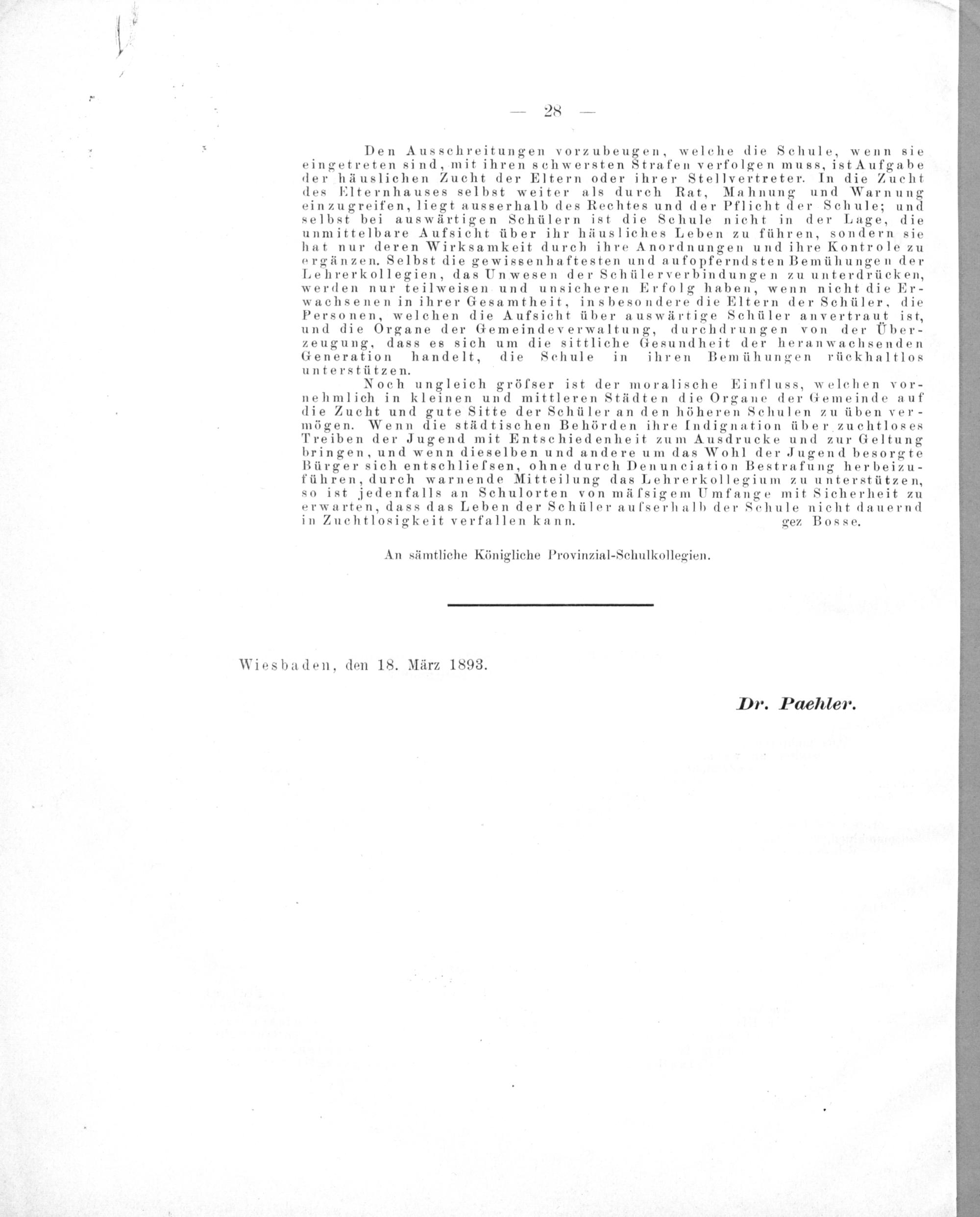 Noch ungleich gröſser ist der moralische Einfluss, welchen vor-— nehmlich in kleinen und mittleren Städten die Organe der Gemeinde auf die Zucht und gutesitte der Schüler an den höheren Schulen zu üben ver- mögen. Wenn die städtischen Behörden ihre Indignation über zuchtloses Treiben der Jugend mit Entschiedenheit zum Ausdrucke und zur Geltung bringen, und wenn dieselben und andere um das Wohl der Jugend besorgte Bürger sich entschliefsen, ohne durch Denunciation Bestrafung herbeizu- führen, durch warnende Mitteilung das Lehrerkollegium zu unterstützen, so ist jedenfalls an Schulorten von mäſsigem Umfange mit Sicherheit zu erwarten, dass das Leben der Schüler aufserhalb der Schule nicht dauernd in Zuchtlosigkeit verfallen kann. gez Bosse.