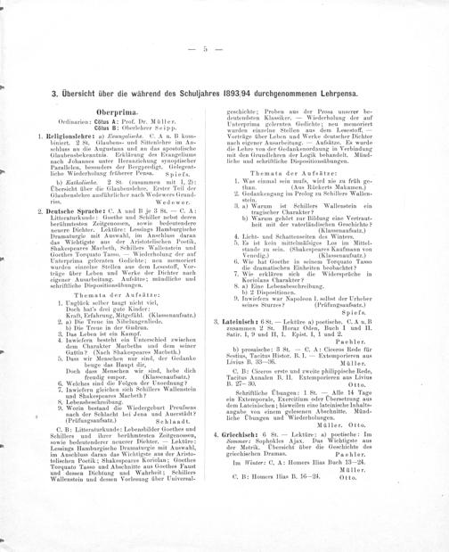 3. Übersicht über die während des Schuljahres 1893/94 durchgenommenen Lehrpensa.