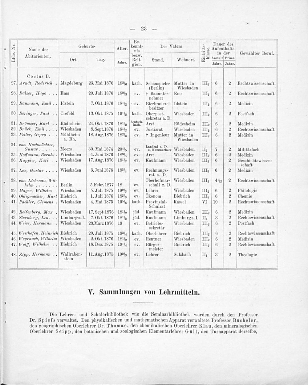 ————— . re„ Dauer des Name der Geburts- Alter. Pennt Des Vaters§ Aufenthalts 2 Abiturienten bezw 55 in 5 dr Gewählter Veruf. Ort. Tag. uure. Feli- Stand. Wohnort. 2 Anstalt Prima ahre. gion Jahre. Jahre. Coetus B. 27. Arndt, Roderich. Magdeburg 23. Mai 1876 185] kath. Schauspieler Mutter in III2 6 2 Rechtswissenschaft (Berlin) Wiesbaden 28. Balzer, Hugo... Ems 20. Juli 1876 18 ⅞G6 ev. † Bauunter- Ems III2 6 2 Rechtswissenschaft nehmer 29. Baumann, Emil.. Idstein 7. Okt. 1876 18 ½h ev. Bierbrauerei- Idstein III2 6 2 Medizin besitzer 3 30. Beringer, Paul.. Crefeld 13. Okt. 1875 19 ½ kath. Oberpost- Wiesbaden III 6 2 Postfach sekretär a. D. 31. Brömser, Karl.. Rüdesheim 24. Okt. 1876 181 ½ dautaeh. Arzt Rüdesheim III 6 2 Medizin 32. Brück, Emil.... Wiesbaden 8. Sept. 1876 18 ½ ev. Justizrat Wiesbaden III2 6 2 Rechtswissenschaft 33. Feller, Georg... Mühlheim 18. Aug. 1876 18 ⅛ ev. f Ingenieur Mutter in IIIg 6 2 Medizin a. Rh. Wiesbaden 34. von Hochuwächter, Landrat a. D Gustav...... Moers 30. Mai 1874 204 ⅞6 ev. u. Kammerherr Wiesbaden II 7 2 Militärfach 35. Hofrmann, Bernh.. Wiesbaden 4. Juni 1876 183 ¾ ev. Arzt Wiesbaden III2 6 2 Medizin 36. Kappler, Karl.. Wiesbaden 17. Aug. 1876 18 ½ ev. Kaufmann Wiesbaden III2 6 2 Geschichtswissen- schaft 37. Lex, Gustav.... Wiesbaden 3. Juni 1876 18 ྠev. Rechnungs- Wiesbaden III2 6 2 Medizin rat a. D. 38. von Liebenau, Wil- 3 Oberhofmar- Wiesbaden IIII 4 ½ 2 Rechtswissenschaft helnn....... Berlin 5. Febr. 1877 18 ev. schall z. D. 39. Mager, Wilhelm. Wiesbaden 5. Juli 1875 19 ⅞ ev. Lehrer Wiesbaden III 6 2 Philologie 40. Ohligmacher, Karl Biebrich 1. Juli 1876 18 ev. Okonom Biebrich IIIg 6 2 Chemie 41. Paehler, Clemens. Wiesbaden 4. Mai 1875 19 ⅝ kath. Penüia Kassel VI 10 2 Rechtswissenschaft chulrat 42. Reifenberg, Maær. Wiesbaden 17. Sept. 1876 18 ½ jüd. Kaufmann Wiesbaden III2 6 2 Medizin 43. Sternberg, Leo... Limburg a. L. 7. Okt. 1876 18 ½ jüd. Kaufmann Limburga. L. III 3 2 RKechtswissenschaft 44. Weise, Hermann. Wiesbaden 23. März 1876 19 ev. Betriebs- Wiesbaden III2 6 2 Postfach sekretär 45. Westhofen, Heinrich Biebrich 29. Juli 1875 19 ¾ kath. Oberlehrer Biebrich IIIe 6 2 Rechtswissenschaft 46. Weyrauch, Wilhelm Wiesbaden 2. Okt. 1876 18 ½ ev. Rentner Wiesbaden III2 6 2 Medizin 47. Wolff, Wilhelm.. Biebrich 16. Dez. 1875 19 ¼ ev. Bürger- Biebrich III 6 2 Rechtswissenschaft meister. 48. Zipp, Hermann.. Wallraben- 11. Aug. 1875 19 ⅞6 ev. Lehrer Sulzbach III 3 2 Theologie . stein