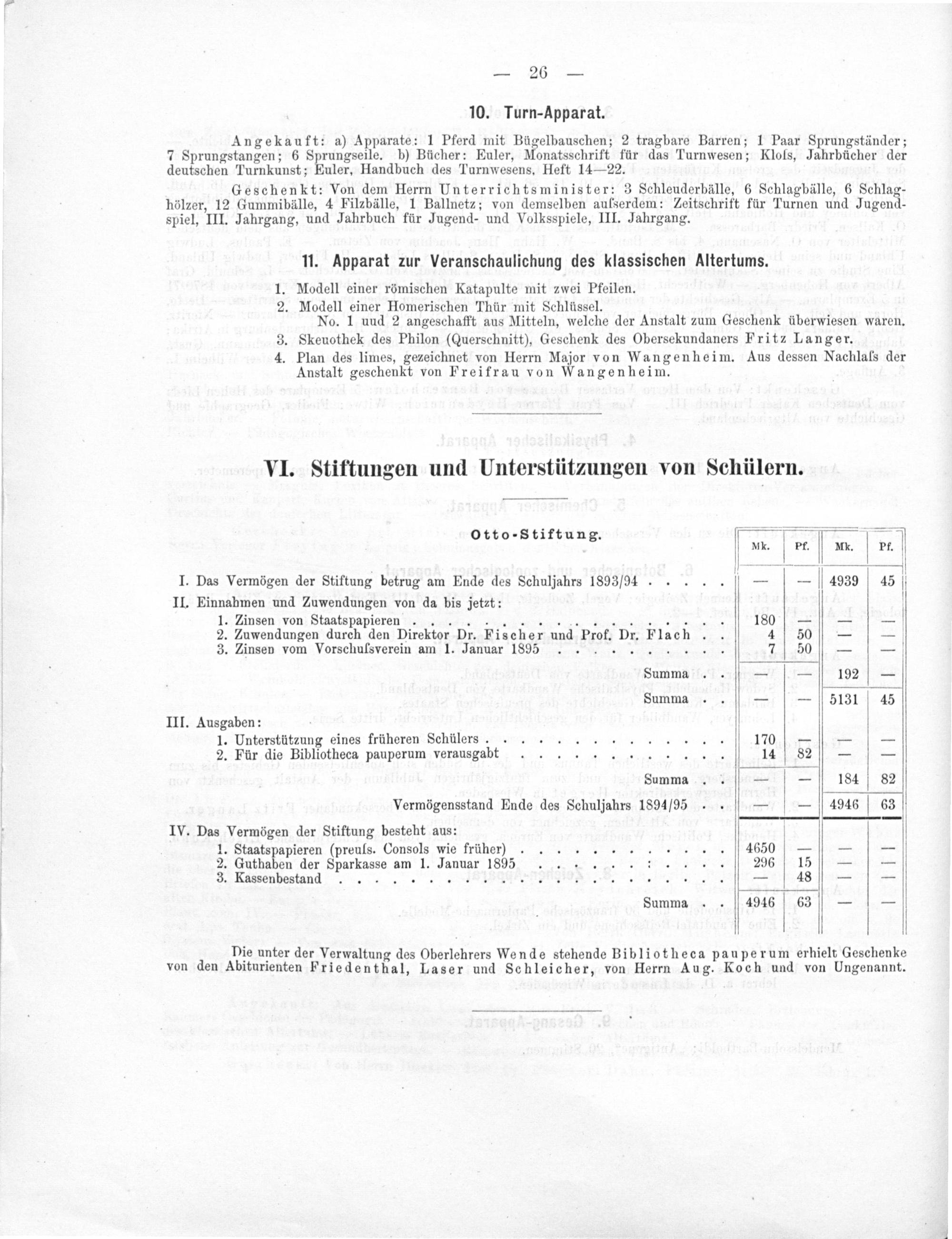 Otto-Stiftung.— Mk. Pf. Mk. Pf. — I. Das Vermögen der Stiftung betrug am Ende des Schuljahrs 1893/94.....—— 4939 45 II. Einnahmen und Zuwendungen von da bis jetzt: 1. Zinsen von Staatspapieren.. 180—— 2. Zuwendungen durch den Direktor Dr. Fischer und piot. Dr. Flach.. 4 50— 3. Zinsen vom Vorschufsverein am 1. Januar 1895..... 7 50— Summa..—— 192— Summa..—— 5131 45 III. Ausgaben: 1. Unterstützung eines früheren Schülers.............. 170——— 2. Für die Bibliotheca pauperum verausgabt............ 14 82⁰ d—— Summa..—— 184 82 Vermögensstand Ende des Schuljahrs 1894/95..—— 4946 63 IV. Das Vermögen der Stiftung besteht aus: 1. Staatspapieren(preuſs. Consols wie früher).......... 4650—— 2. Guthaben der Sharlnse am 1. Januar 1895,........... 296 15—— 3. Kassenbestand......... 9........— 48 Summa 4946 63——
