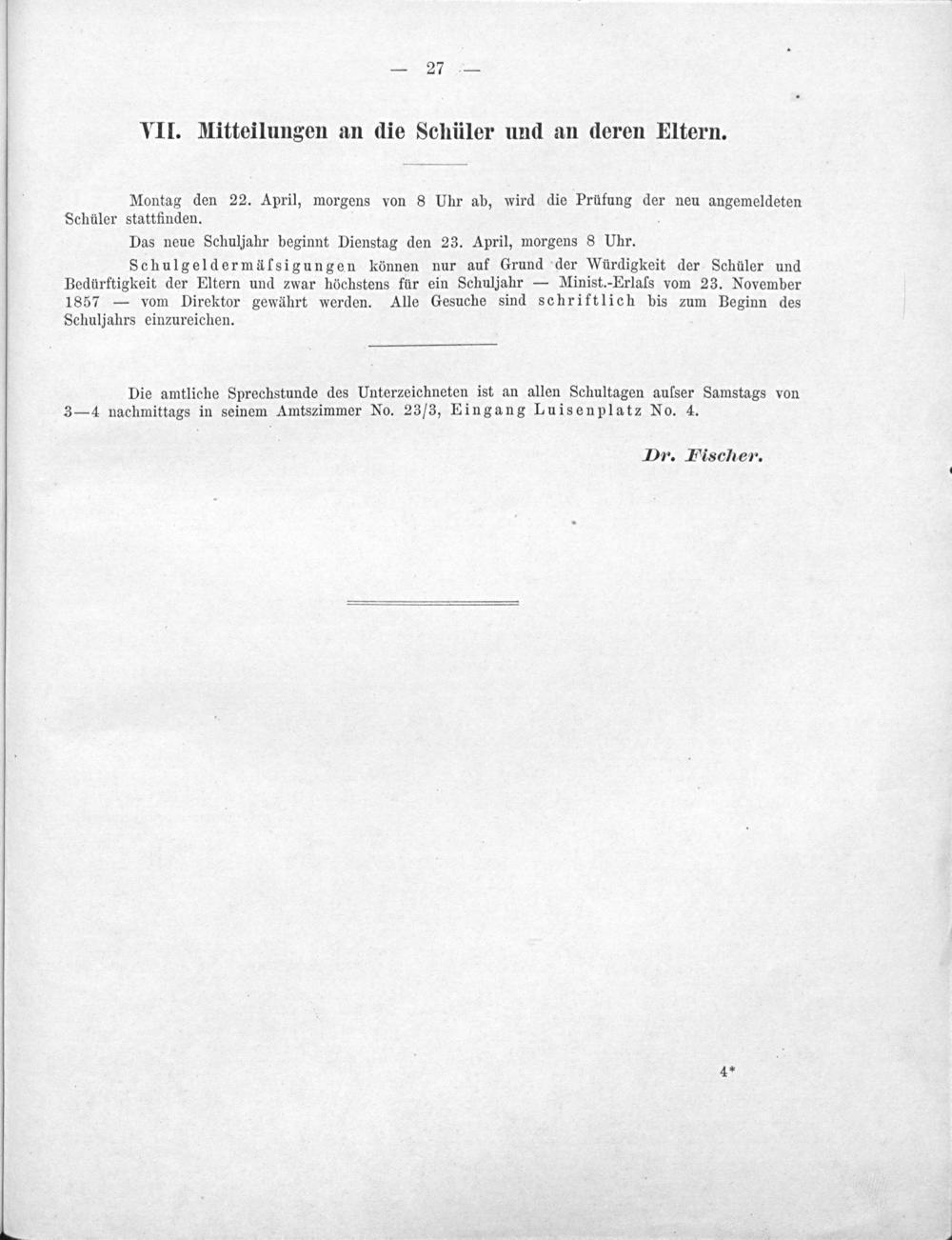 Die amtliche Sprechstunde des Unterzeichneten ist an allen Schultagen aufser Samstags von 3— 4 nachmittags in seinem Amtszimmer No. 23/3, Eingang Luisenplatz No. 4.