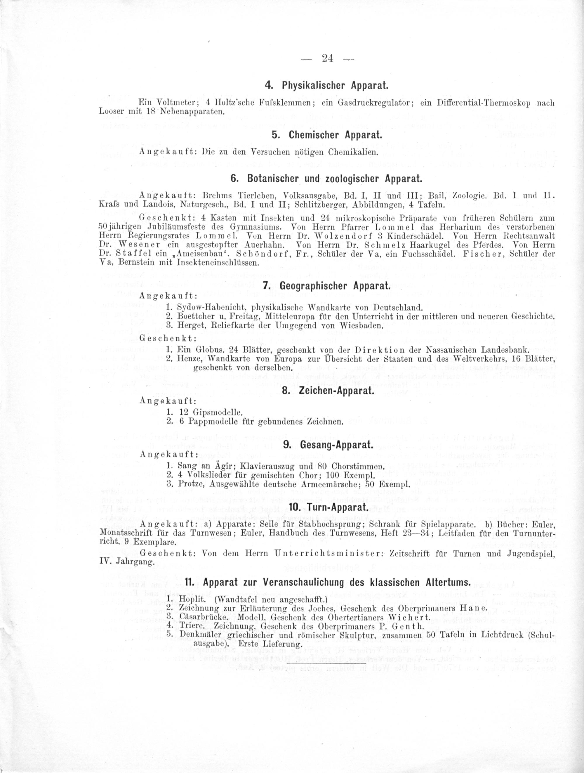 Angekauft: Brehms Tierleben, Volksausgabe, Bd. I, II und III; Bail, Zoologie. Bd. I und II. Kraſs und Landois, Naturgesch., Bd. I und II; Schlitzberger, Abbildungen, 4 Tafeln.