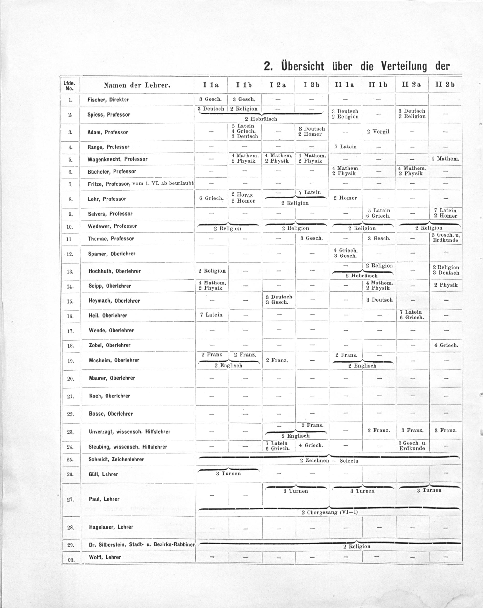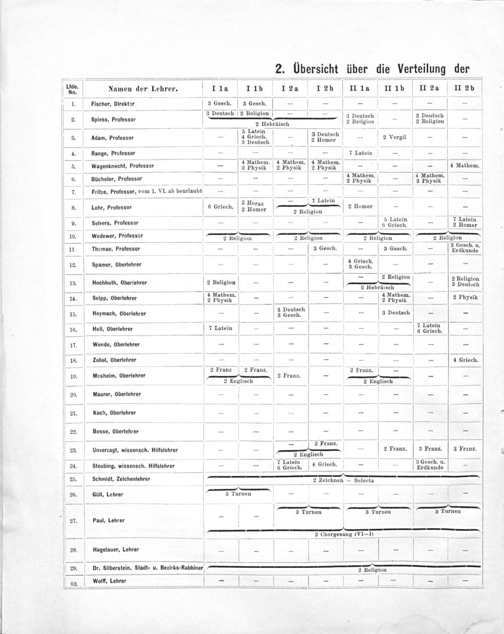 . . Namen der Lehrer. 1 14 f.111b 1 2a 125 V Il 1a II 1b V II 2a 1I1 2b V 1. fischer, kektr 3 Gesch. 3 Gesch.—————— Q·¶·¶¶¶¶¶¶¶(((¶Q¶¶ q——,;ͥ⏑ↄ/A-————— 2. Spiess, Professor utsch Religion——— 3 Deutsch. 3 Deutsch . Spiess, 2 Hebräisch 2 Religion 2 Religion V 5 Latein 3 Deutsch 1 82-24—— 5 3. Adam, Professor— 4 Griech.— feuisch— 2 Vergil—— —— dPeukech. Homer— V 4. Range, Professor——— 7 Latein——— P.a⸗ 4 Matl 1r e 4 Mathem. 5. Wagenknecht, professor—— 2² Physik 2 Physik- 2 Whihe—— 4 Mathem 4— 4 AMn 4 Mathem. 3 6.. Büeheler, Proſessor.. 1 1 2 Physikt-— 4 2 Physik— 7. Fritze, Professor, vom 1. VI. ab beurlaubt——— 1————— 2 Horaz— Latein— b 8. Lohr, Professor 6 Griech. 2 Homer——— — 2 Momor 2 Religion .—————— 1 5 Latein 7 Latein 9. Selvens, Protesspr 1 1 6 Griech— 2 Homer —/— 10. Wedewer, Professor 2 Religion 2 Religion 1 2 Religion V 2 Religion ———yö—— 4 Griech.— 12. Spamer, Oberlehrer——— 3 Gesch-—— 1——— 2 Religion— 2 Rr 13. Hochhuth, Oberlehrer 2 Religion—— V—— 2 Pohfion r— 2 Hebräisch— de 4 Mathem.(1 Mathem.[ pr h. 14. Seipp, Oberlehror 2 Physik——— I— 2 Physik 2 Physik ————— 2 Eysik—— 15. Heymach, Oberlehrer—— 3 Peukerh—— 3 Deutsch—— 2*—„SINAN———— 7 Latein— 16. Heil, Oberlehrer 7 Latein—— 6 Griech.— —— 17. Wencde, Oberlehrer— V-——-=— 18. QZobel, obenehrer—————— 4 Griech lm 2 Franz 2 Franz..— 2 Fraz.—— 19. MWosheim, Oberlehrer— 2 Franz.——— — 2 Englisch 2 Englisch ——.——— 20. Maurer, Oberlehrer—————— V—— ———— 1 21. V Koch, Oberlehrer—— 1————— -———————————— 22. Bosse, Oberlehrer————— 2— —————— *— 2 Franz. 23. Unyerzagt, wissensch. Hilfslehrer———— 2 Franz. 3 Franz. 3 Franz. 2 Englisch —.—— 1 te 4——— 3 esch. u.— E 24. Steubing, wissensch. luts eyrer— Petein. 4 Griech.—— Prdeune 8 Schmidt, zeichenlehrer V 2 Zeichnen— Scelocta —————————— 26. Güll, Lehrer Turnen—————— — V V———— 3 Turnen 3 Turnen 3 Turnen 27. Paul, Lehrer— ————. cSborgesang(VI- 1)——“ 28. Hagelauer, Lehrer——— V————— —— 29. hr. Silberstein. Stadt- u. Bezirks-Rabbiner 2Raion — 5— wed 08. Wolff, Lehrer———— 5.