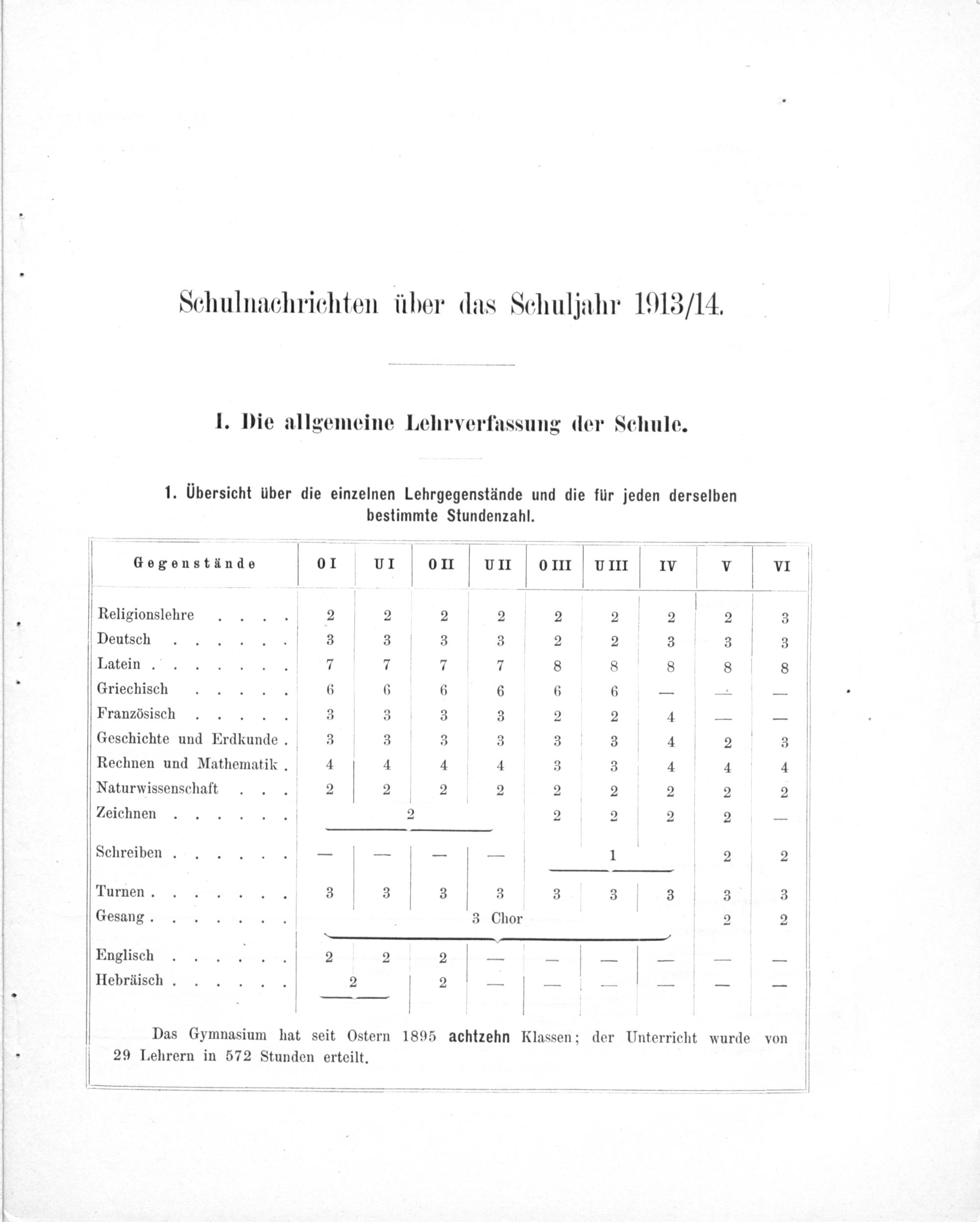 Das Gymnasium hat seit Ostern 1895 achtzehn Klassen; 29 Lehrern in 572 Stunden erteilt.