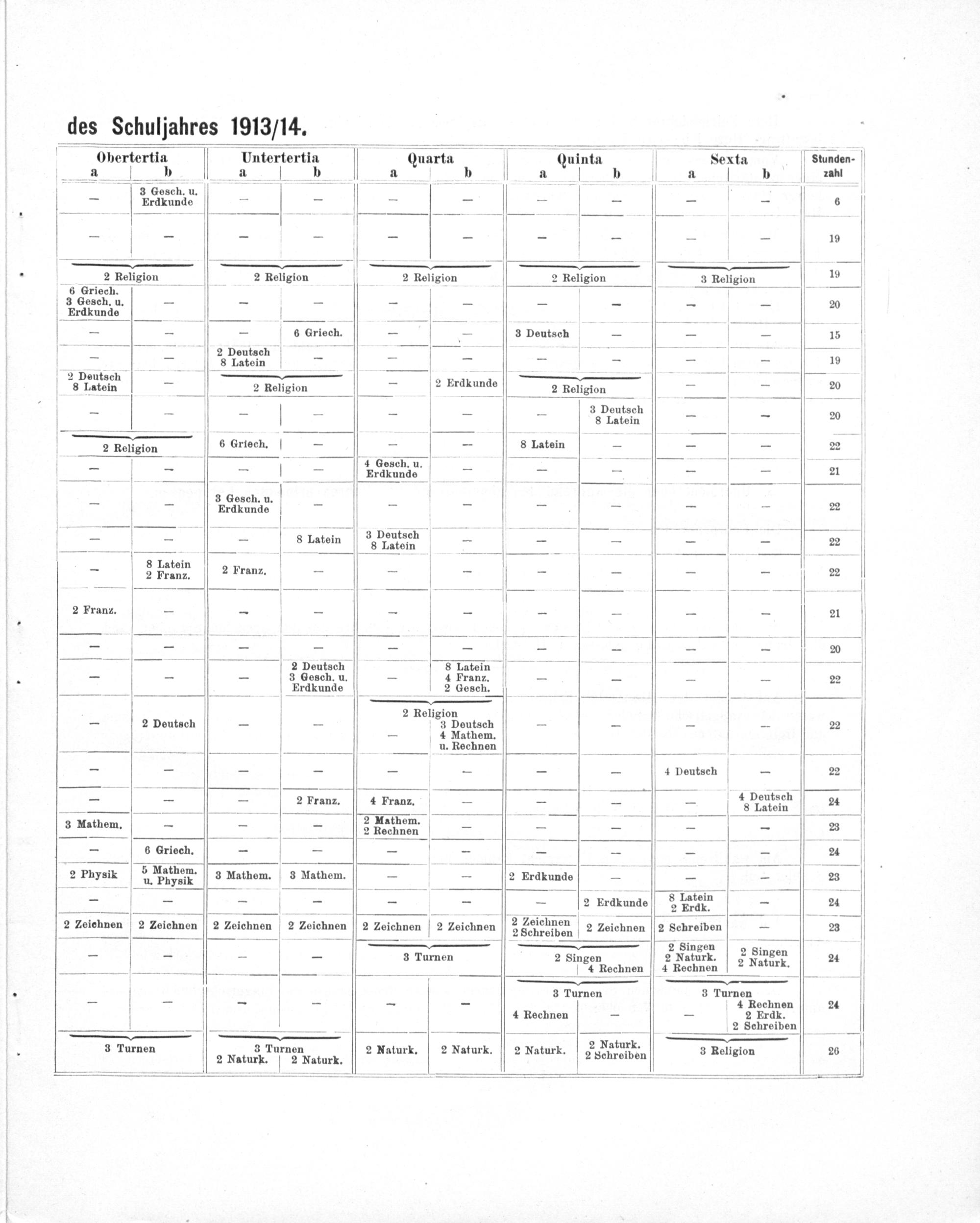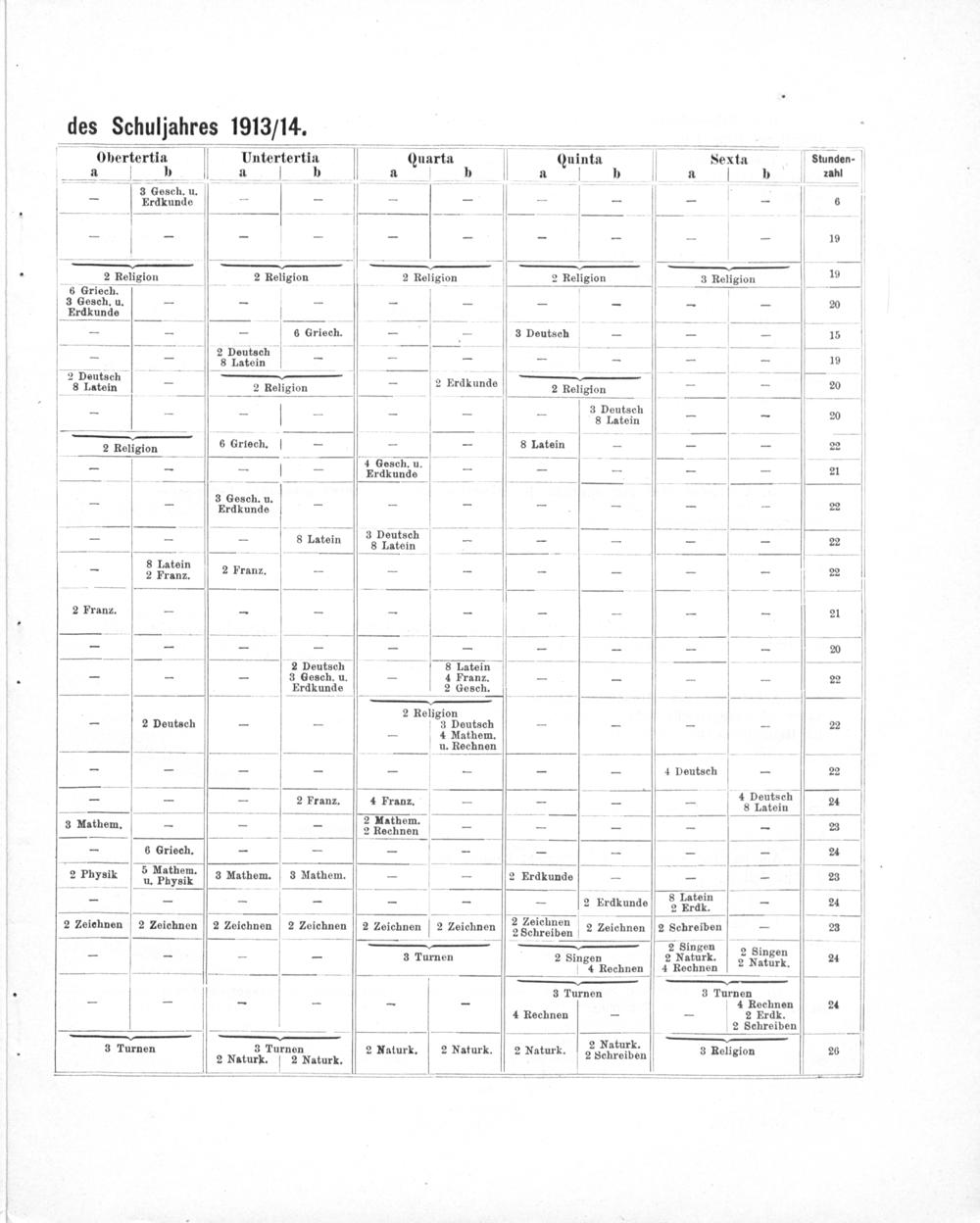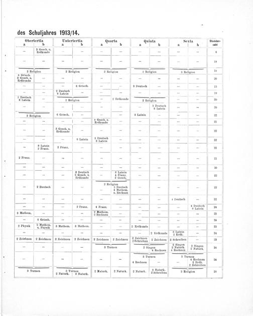 — Erdkunde———————— 6' ——————— —————————— 19 ———————— Religion 2 Religion 2 Religion 2 Religion 3 Religion 12 6 Griech.—— 3 Gesch. u.————————— 20 Erdkunde 1— ——— 6 riech.—— 3 Deutsch—-[— —— 2 veiine—————--————, —— 8 Latein———— 19 2 Deutsch—ↄr.—„ S Lateim— 2 Religion— ² Prdkunde 2 Religion..—— ————— 3 Deutsch — 8 Latein—— 20 —————ͦ—ᷣ—V ͦ ͦ Oͦ:xᷣ—— 1.—————— 2 Religion 6 Griech.——— 8 Latein——— 22 7 1 4 Gesch. u..,„.S — 1 Lrdkunde———-— 21 — 1 3 Gesch. u. —— Erdkunde——————— 22 ——4—.————————— ——— 3 Deutsch——— 8 Latoin 8 Latein 1— 22 1 8 Latein — 2 Franz. 2 Franz.—————— 22 2 Franz.————————— 21 —————————— 20 — 2 Deutsch 8 Latein ——— 3 Gesch. u.— 4 Franz.———— 22 Erdkunde ᷓ¶. 2 Gesch.. 2 Religion — 2 Deutsch—— 3 Deutsch———— 22 — 4 Mathem. —— u. Rechnen 1. ———————— 4 Deutsch— 22 ——— 2 Franz. 4 Franz.————— 24 2 Mathem. in 3 Mathem.——— 2 Rechnen—(——— ö“ 2 — 6 Griech.——————— 24 2 Physik 5 Mathem. 3 Mathem. 3 Mathem—— 2 Erdkunde——-=2. u. Physik———— —— t. 77—— —=— 2 Lrdkunde 8 latain-. 2. 2 Zeichnen 2 Zeich 2 zcieh ben zciehmenſ2 Zeich 2 Leichnen 2üZaelden 2 Zeichnen 2 Schreiben— 23 — ln— 2 Singen 2 Si ———— 3 Turnen 2 Singen 2 Naturk. ngen 24 ——— hEeN chnen 4 Rochnen 2² Naturk. 1 1 3 Turnen 3 Turnen —————— 4 Rechnen 24 4 Rechnen—— 2 Erdk. —————. 2 Schreiben 3 Turnen 3 Turnen 2 Naturk. 2 Naturk. 2 Naturk. V 2 Naturk. 3 Religion 26 2 Naturk. V 2 Naturk. I 2 Schreiben 8
