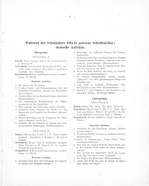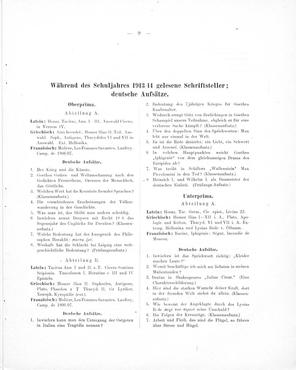 Während des Schuljahres 1913 14 gelesene Schriftsteller; deutsche Aufsätze.