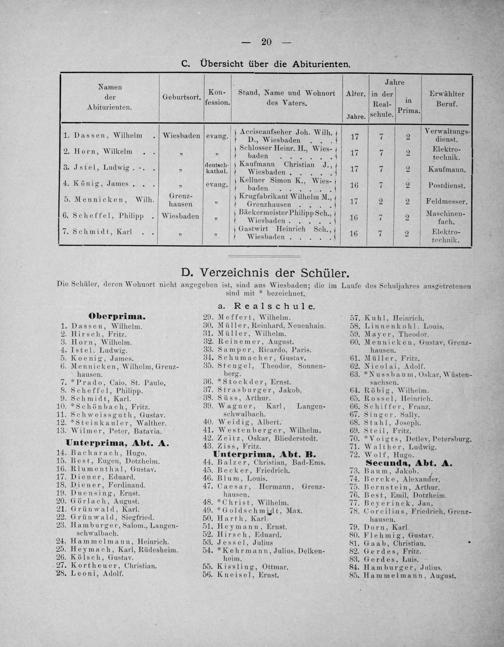 Oberprima. 29. Meffert, Wilhelm. 57. Kuhl, Heinrich. 1. Dassen, Wilhelm. 30. Müller, Reinhard, Neuenhain. 58. Linnenkohl. Louis. 2. Hirsch, Fritz. 31. Müller, Wilhelm. 59. Mayer, Theodor. 3. Horn, Wilhelm. 32. Reinemer, August. 60. Mennicken, Gustav, Grenz- 4. IStel. Ludwig. 33. Samper, Ricardo, Paris. hausen. 5. Koenig, James. 34. Schumacher, Gustav. 61. Müller, Fritz. 6. Mennicken, Wilhelm, Grenz- 35. Stengel, Theodor, Sonnen- 62. Nicolai, Adolf. hausen. berg. 63.*NXNusSbaum, Oskar, Wüsten- 7.* Prado, Caio, St. Paulo. 36.*Stockder, Ernst. sachsen. 8. Scheffel, Philipp. 37. Strasburger, Jakob. 64. Röbig, Wilhelm. 9. Schmidt, Karl. 38. Süss, Arthur. 65. Rossel, Heinrich. 10.*Schönbach, Fritz. 39. Wagner, Karl, Langen- 66. Schiffer, Franz. 11. Schweissguth, Gustav. schwalbach. 67. Singer. Sally. 12.*Steinkauler, Walther. 40. Weidig, Albert. 68. Stahl, Joseph. 13. Wilmer, Peter, Batavia. 41. Westenberger, den. 49 Steil, Fritz. lge— 42. Zeitz, Oskar, Bliederstedt. 70.*Voigts, Detlev, Petersburg. Unterprima, Abt. A. 43. Ziss, Fritz. 71. Walther„Ludwig. 4 14. Bacharach, Hugo. Unterprima, Abt. B. 72. Wolf, Hugo. 15. Best, Eugen, Dotzheim. 44. Balzer, Christian, Bad-Ems. Secunda, Abt. A. 16. Rlumenthal, Gustav. 45. Becker, Friedrich. 73. Baum, Jakob. 17. Diener, Eduard. 46. Blum, Louis. 74. Berc k. e, Alex candfer. 18. Diener, Ferdinand. 47. Caesar, Hermann, Grenz- 75. Bernstein, Arthur. 19. Duensing, Ernst. hausen. 76. Best, Emil, Dotzheim. 20. Görlach, August. 48.*Christ, Wilhelm. 77. Beyerinck, Jan. 21. Grünwald, Karl. 49.*Goldschmilt, Max. 78. Corcilius, Friedrich, Grenz- 22. Grünwald, Siegfried. 50. Harth, Karl hausen. 23. Hamburger, Salom., Langen- 51. Heymann, Urnst. 79. Dorn, Karl. schwalbach. 52. Hirsch, Eduard. 80. Flehmig, Gustav. 24. Hammelmann, Heinrich. 53. Jessel, Julius 81. Gaab, Christian. d 25. Heymach, Karl, Rüdesheim. 54.*Kehrmann, Julius. Delken- 82. Gerdes, Fritz. 26. Kölsch, Gustav. heim. 83. Gerdes, Luis. 27. Kortheuer, Christian. 55. Kissling, Ottmar. 84. Hamburger, Julius.