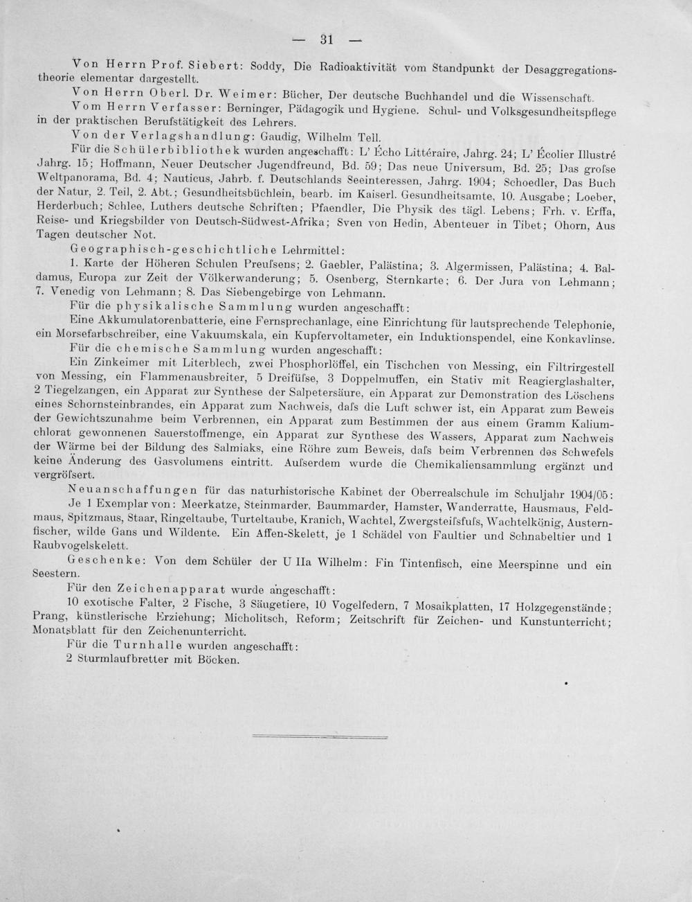 Für die Schülerbibliothek wurden angeschafft: L' Echo Littéraire, Jahrg. 24; L' Ecolier Illustré Jahrg. 15; Hoffmann, Neuer Deutscher Jugendfreund, Bd. 59; Das neue Universum, Bd. 25; Das grolse Weltpanorama, Bd. 4; Nauticus, Jahrb. f. Deutschlands Seeinteressen, Jahrg. 1904; Schoedler, Das Buch der Natur, 2. Teil, 2. Abt.; Gesundheitsbüchlein, bearb. im Kaiserl. Gesundheitsamte, 10. Ausgabe; Loeber, Herderbuch; Schlee, Luthers deutsche Schriften; Pfaendler, Die Physik des tägl. Lebens; Frh. v. Erffa, Reise- und Kriegsbilder von Deutsch-Südwest-Afrika; Sven von Hedin, Abenteuer in Tibet; Ohorn, Aus Tagen deutscher Not.