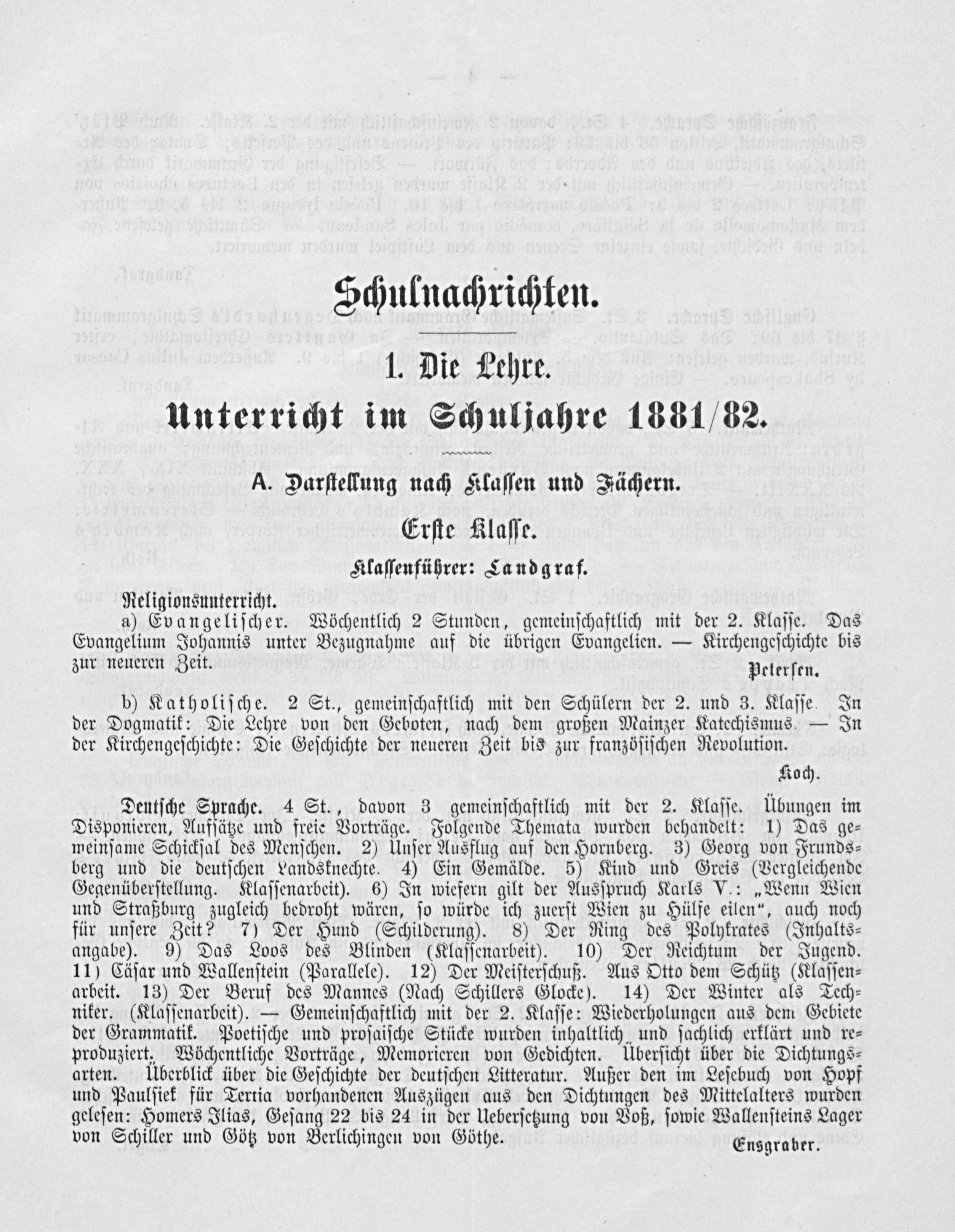 Deutſche Sprache. 4 St., davon 3 gemeinſchaftlich mit der 2. Klaſſe. Ubungen im Disponieren, Aufſätze und freie Vorträge. Folgende Themata wurden behandelt: 1) Das ge⸗ meinſame Schickſal des Menſchen. 2) Unſer Ausflug auf den Hornberg. 3) Georg von Frunds⸗ berg und die deutſchen Landsknechte. 4) Ein Gemälde. 5) Kind und Greis(Vergleichende Gegenüberſtellung. Klaſſenarbeit). 6) In wiefern gilt der Ausſpruch Karls V.:„Wenn Wien und Straßburg zugleich bedroht wären, ſo würde ich zuerſt Wien zu Hülfe eilen“, auch noch für unſere Zeit? 7) Der Hund(Schilderung). 8) Der Ring des Polykrates(Inhalts⸗ angabe). 9) Das Loos des Blinden(Klaſſenarbeit). 10) Der Reichtum der Jugend. 11) Cäſar und Wallenſtein(Parallele). 12) Der Meiſterſchuß. Aus Otto dem Schütz(Klaſſen⸗ arbeit. 13) Der Beruf des Mannes(Nach Schillers Glocke). 14) Der Winter als Tech⸗ niker.(Klaſſenarbeit).— Gemeinſchaftlich mit der 2. Klaſſe: Wiederholungen aus dem Gebiete der Grammatik. Poetiſche und proſaiſche Stücke wurden inhaltlich, und ſachlich erklärt und re⸗ produziert. Wöchentliche Vorträge, Memorieren von Gedichten. Überſicht über die Dichtungs⸗ arten. Überblick über die Geſchichte der deutſchen Litteratur. Außer den im Leſebuch von Hopf und Paulſiek für Tertia vorhandenen Auszügen aus den Dichtungen des Mittelalters wurden geleſen: Homers Ilias, Geſang 22 bis 24 in der Ueberſetzung von Voß, ſowie Wallenſteins Lager von Schiller und Götz von Berlichingen von Göthe. Ensgraber.