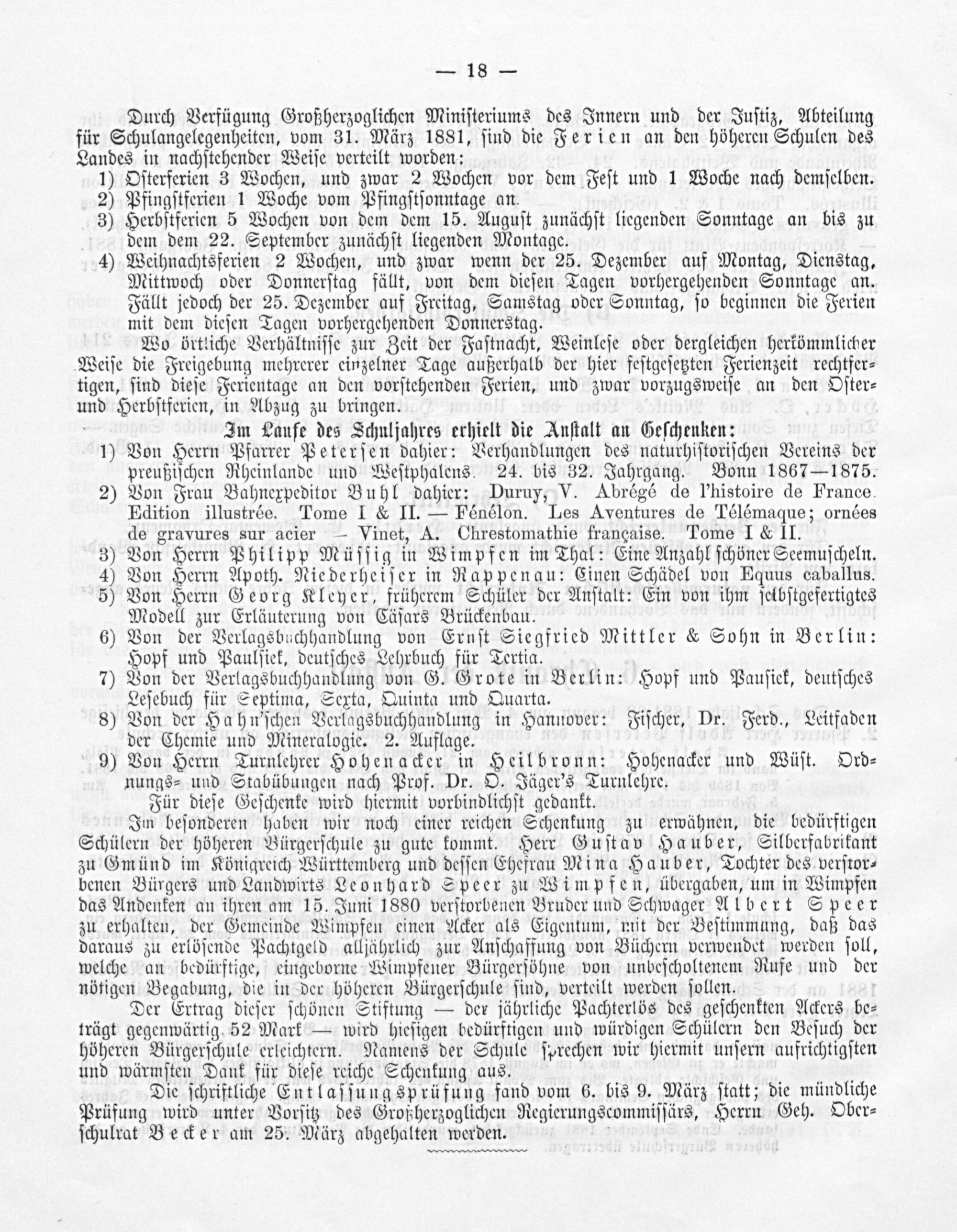 Im beſonderen haben wir noch einer reichen Schenkung zu erwähnen, die bedürftigen Schülern der höheren Bürgerſchule zu gute kommt. Herr Guſtav Hauber, Silberfabrikant zu Gmünd im Königreich Württemberg und deſſen Ehefrau Mina Hauber, Tochter des verſtor⸗ benen Bürgers und Landwirts Leonhard Speer zu Wimpfen, übergaben, um in Wimpfen das Andenken an ihren am 15. Juni 1880 verſtorbenen Bruder und Schwager Albert Speer zu erhalten, der Gemeinde Wimpfen einen Acker als Eigentum, mit der Beſtimmung, daß das daraus zu erlöſende Pachtgeld alljährlich zur Anſchaffung von Büchern verwendet werden ſoll, welche an bedürftige, eingeborne Wimpfener Bürgerſöhne von unbeſcholtenem Rufe und der nötigen Begabung, die in der höheren Bürgerſchule ſind, verteilt werden ſollen.