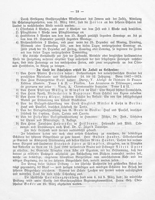 Durch Verfügung Großherzoglichen Miniſteriums des Innern und der Juſtiz, Abteilung für Schulangelegenheiten, vom 31. März 1881, ſind die Ferien an den höheren Schulen des Landes in nachſtehender Weiſe verteilt worden: