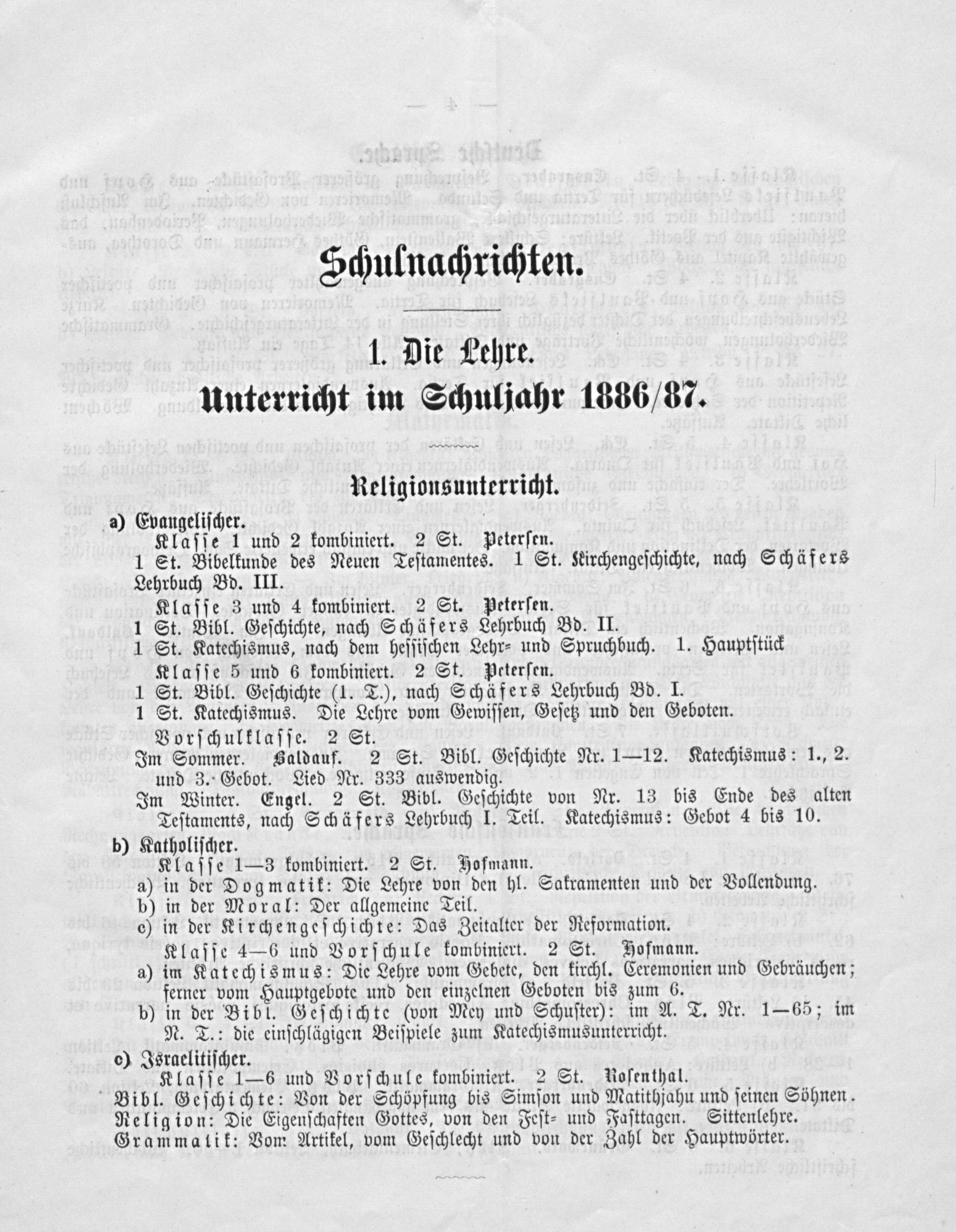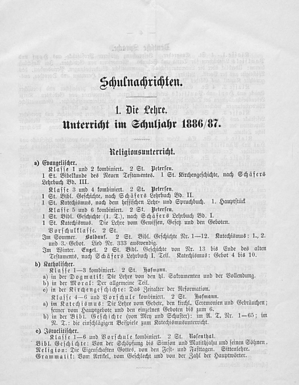 a) Evangeliſcher. Klaſſe 1 und 2 kombiniert. 2 St. Peterſen. 1 St. Bibelkunde des Neuen Teſtamentes. 1 St. Kirchengeſchichte, nach Schäfers Lehrbuch Bd. III. Klaſſe 3 und 4 kombiniert. 2 St. Peterſen. 1 St. Bibl. Geſchichte, nach Schäfers Lehrbuch Bd. II. 1 St. Katechismus, nach dem heſſiſchen Lehr⸗ und Spruchbuch. 1. Hauptſtück Klaſſe 5 und 6 kombiniert. 2 St. Peterſen. 1 St. Bibl. Geſchichte(1. T.), nach Schäfers Lehrbuch Bd. I. 1 St. Katechismus. Die Lehre vom Gewiſſen, Geſetz und den Geboten. Vorſchulklaſſe. 2 St. Im Sommer. Zaldauf. 2 St. Bibl. Geſchichte Nr. 1—12. Katechismus: 1., 2. und 3. Gebot. Lied Nr. 333 auswendig. Im Winter. Engel. 2 St. Bibl. Geſchichte von Nr. 13 bis Ende des alten Teſtaments, nach Schäfers Lehrbuch I. Teil. Katechismus: Gebot 4 bis 10. b) Katholiſcher. Klaſſe 1— 3 kombiniert. 2 St. Yofmann. a) in der Dogmatik: Die Lehre von den hl. Sakramenten und der Vollendung. b) in der Moral: Der allgemeine Teil. c) in der Kirchengeſchichte: Das Zeitalter der Reformation. Klaſſe 4—6 und Vorſchule kombiniert. 2 St. HBofmann. a) im Katechismus: Die Lehre vom Gebete, den kirchl. Ceremonien und Gebräuchen; ferner vom Hauptgebote und den einzelnen Geboten bis zum 6. b) in der Bibl. Geſchichte(von Mey und Schuſter): im A. T. Nr. 1— 65; im N. T.: die einſchlägigen Beiſpiele zum Katechismusunterricht. 0) Israelitiſcher. Klaſſe 1—6 und Vorſchule kombiniert. 2 St. Koſenthal. Bibl. Geſchichte: Von der Schöpfung bis Simſon und Matithjahu und ſeinen Söhnen. Religion: Die Eigenſchaften Gottes, von den Feſt⸗ und Faſttagen. Sittenlehre. Grammalik: Vom Artikel, vom Geſchlecht und von der Zahl der Hauptwörter.