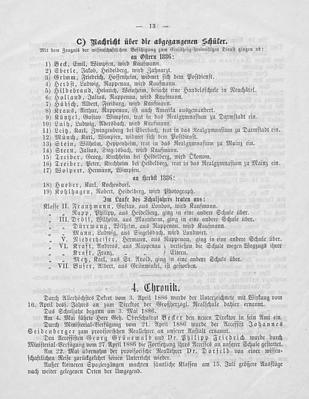 an Herbſt 1836: 18) Hueber, Karl, Kochendorf. 19) Kohlhagen, Robert, Heidelberg, wird Photograph. Im Laufe des Schuljahres traten aus: Klaſſe II. Frantzmann, Guſtav, aus London, wird Kaufmann. „„ Rapp, Philipp, aus Heidelberg, ging in eine andere Schule über. „ III. Dröll, Wilhelm, aus Mannheim, ging in eine andere Schule über. „„ Dürrwang, Wilhelm, aus Rappenau, wird Kaufmann. „„ Mann, Ludwig, aus Siegelsbach, wird Landwirt. „ V. Niederheiſer, Hermann, aus Rappenau, ging in eine andere Schule über. „ VI. Kraft. Andreas, aus Rappenau verließen die Schule wegen Wegzugs ihrer „„ Kraft, Franz,„ Eltern. „„ Metz, Karl, aus St. Avold, ging in eine andere Schule über. VII. Buſer, Albert, aus Grünwinkel, iſt geſtorben.