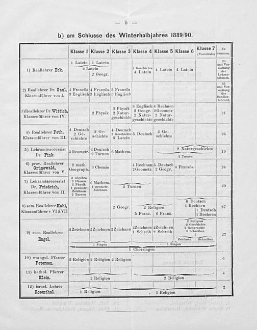 — Klasse 7 2a V Klassel Klasse 2 Klasse 3 Klasse 4 Klasse 5 Klasse 6 schule) eummen. 1 Latein 1 Latein un Tlr. 1) Reallehrer Eok. 2 Latein 2 Goschichten 4 Latein 4 Latein valnuns 2 Geogr. 4 Latein Tehner. biblioth. un Je. 2) Reallehrer Dr. Gaul, 4 Französ4 Französ. 5 Französ waltung Klassenführer von I. 3 Englisch3 Englisch3 Englisch der . Schüler- biblioth. ;L 3 Englisch4 Rechnen 3)Reallehrer Dr. Wittich 2 Physik 2 Geogr. 2 Geometr 3) Reallehrer Dr. Wittich, 2 Physik 2 Natur- 2 54 Sr. 26 A 2 21 Klassenführer von IV. schic 2 Natur- 2 Natur- geschichte 1 3 geschichteſgeschichte 4 Deutsch„ 4 Deutsch. 4) Reallehrer Peth, 2 Ge- 2 ſäde 2 Geschichte5 Deutsch 2 Gern. 24 Klassenführer von III. schichte Séhichte 3 Latein schichte p————— ac t schi 5) Lehramts 1 3 Geometr. 4Denisen 6 Mathem. zNaturgeschichte 19 Dr. Fink. 9 2 Turnen 6) prov. Reallehrer 2 math 4 Rechnenb Deutsch Grüunewald, Ge h 3 Chemie 4 5 6 Französ. 24 Klassenfünrer von V. ograph. 2 Geometr. 2 Geogr. 7) Lehramt ist 4 dwenls ehramtsaccessis 3 Chemie 6 Mathem.— Dr. Priedrich, de LMxeat. Eoometr— Turnen 20 Klassenführer von II. Zelehnen eiounan urnen 6 Deutsch 8) sem. Reallehrer Kahl, 2 Geogr. Relniomn 4 Rechnen 27 Klassenführer v. VI&VII 2 3 1 Deutsch 5 Franz. 6 Franz. 1 Rechnen ——— 2 Religion 2 deschicht 2 Zeichnen 2 Zeichnenſe Zeichnen 2Zeichnen 2Zeichnen 2 Geoxraphie 1 9) sem. Reallehrer 1 Schreib 2 Sehreib 3 Schyoiben 27 Engel. V—— zeichnen Fehreiben 1 Singen 1 Singen— 1 Chorsingen 10) exangel. Pfarrer Religion 2 Religion 2 Religion 6 Petersen. V 11) kathol. Pfarrer—. 4 Klein. 2 Religion 2 Religion 4 12) israel. Lehrer—— 3 2. Rosenthal. 1 Religion i Reüiwion V