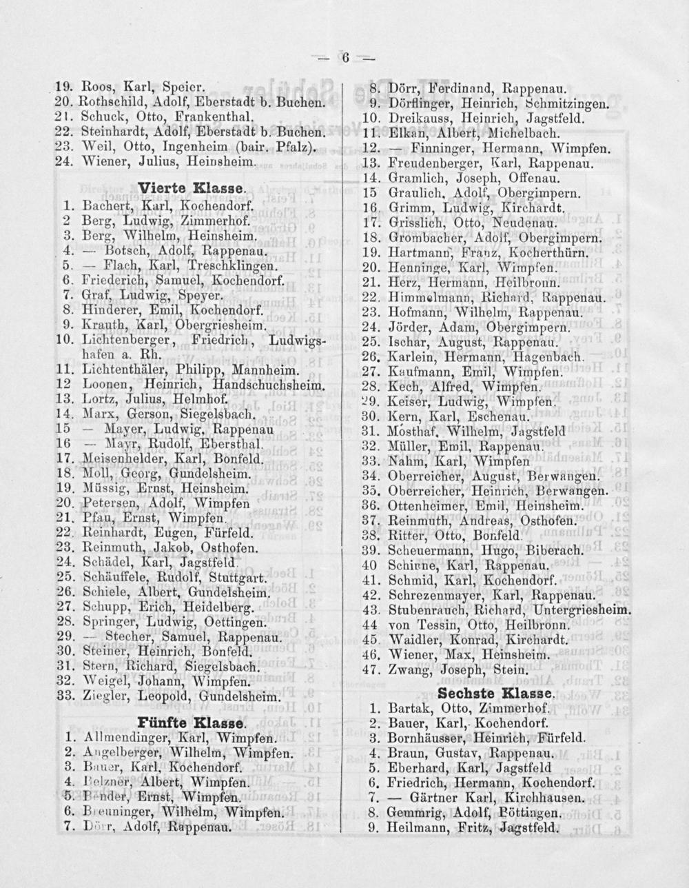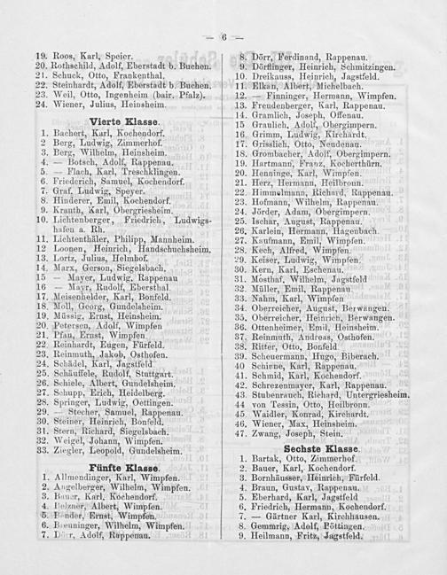 Vierte Klasse. Bachert, Karl, Kochendorf. Berg, Ludwig, Zimmerhof. Berg, Wilhelm, Heinsheim. — Botsch, Adolf, Rappenau. — Flach, Karl, Treschklingen. Friederich, Samuel, Kochendorf. Graf, Ludwig, Speyer. Hinderer, Emil, Kochendorf. Krauth, Karl, Obergriesheim. Lichtenberger, Friedrich,