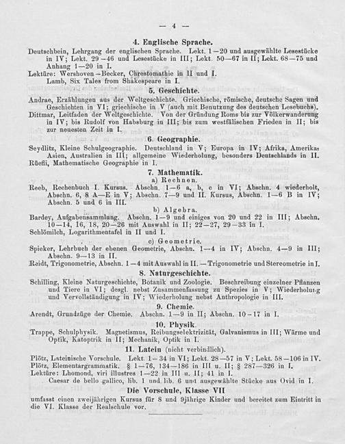 10. Physik. Trappe, Schulphysik. Magnetismus, Reibungselektrizität, Galvanismus in III; Wärme und Optik, Katoptrik in II; Mechanik, Optik in I. 11. Latein(nicht verbindlich). Plötz, Lateinische Vorschule. Lekt. 1— 34 in VI; Lekt. 28— 57 in V; Lekt. 58— 106 in IV.