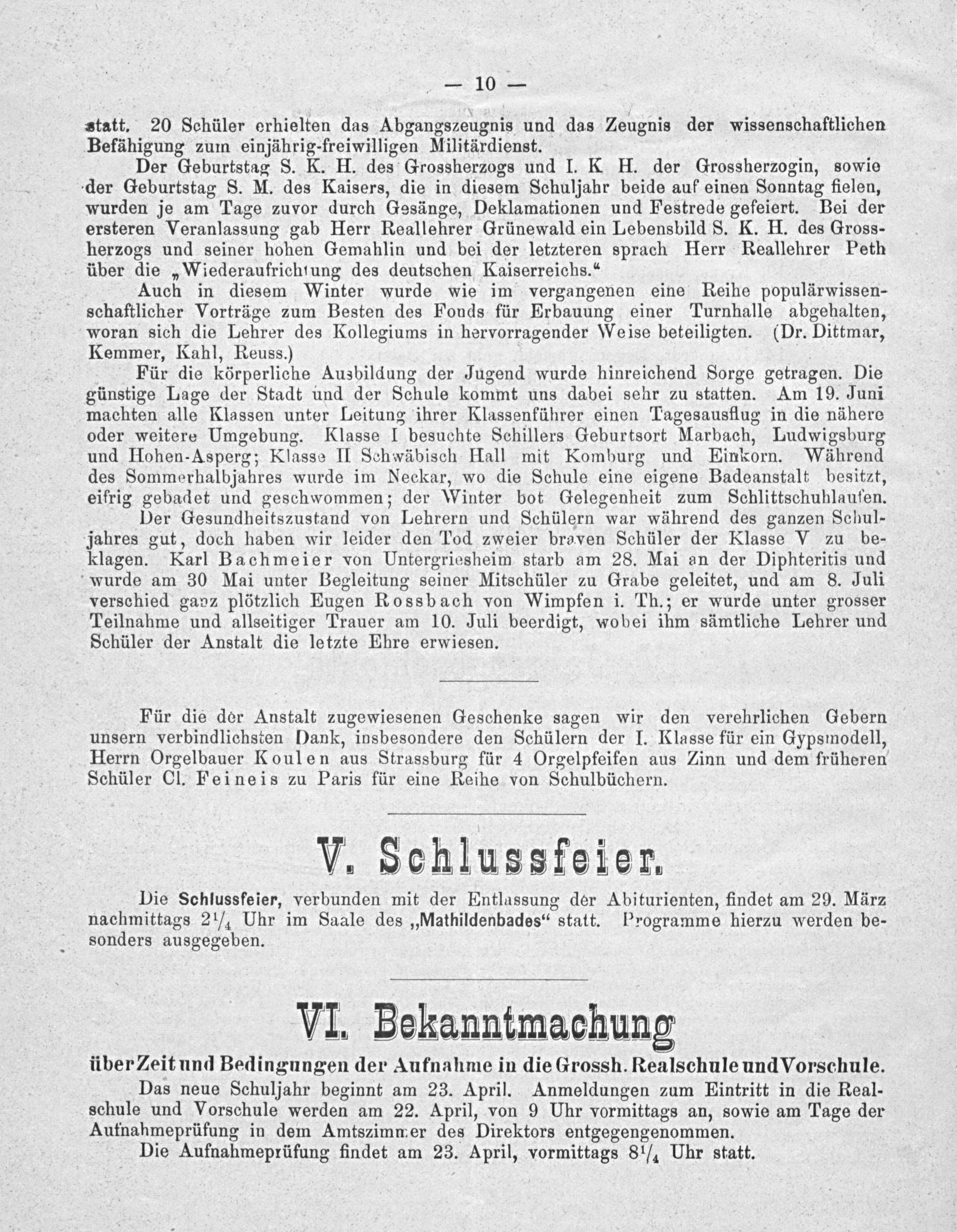 Der Gesundheitszustand von Lehrern und Schülern war während des ganzen Schul- jahres gut, doch haben wir leider den Tod zweier braven Schüler der Klasse V zu be- klagen. Karl Bachmeier von Untergriesheim starb am 28. Mai an der Diphteritis und wurde am 30 Mai unter Begleitung seiner Mitschüler zu Grabe geleitet, und am 8. Juli verschied ganz plötzlich Eugen Rossbach von Wimpfen i. Th.; er wurde unter grosser Teilnahme und allseitiger Trauer am 10. Juli beerdigt, wobei ihm sämtliche Lehrer und Schüler der Anstalt die letzte Ehre erwiesen.