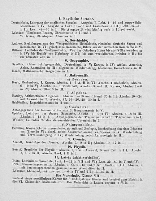 7. Mathematik. a) Rechnen. Reeb, Rechenbuch, I. Kursus, Abschn. 1— 6 A, B in VI; Abschn. 4 wiederholt, Abschn. 6— 10 in V; Abschn. 6— 8 wiederholt, Abschn. 9 und II. Kursus, Abschn. 1— 6 in IV; Abschn. 10—13 in III. b) Algebra. Bardey, Arithmetische Aufgaben. Abschn. 1— 10 und 19 und 20 in III; Abschn. 10— 24 mit Auswahl in II, Abschn. 17, 20— 26, 28— 30 in I. Schlömilch, Logarithmentafel in II und I. c) Geometrie Anfangsgründe der Geometrie bis zum 3. Kongruenzsatz in V. Spieker, Lehrbuch der ebenen Geometrie, Abschn. 1— 4 in IV; Abschn. 4—8 in III. Abschn. 9— 13 in II.— Anfangsgründe der Trigonometrie in II. Trigonometrie in I. Wehner, Leitfaden für den stereometrischen Unterricht in I. 8. Naturgeschichte. Schilling, Kleine Schulnaturgeschichte, Botanik und Zoologie, Beschreibung einzelner Pflanzen und Tiere in VI; desgl. nebst Zusammenfassung zu Spezies in V; Wiederholung und Vervollständigung in IV; Wiederholung nebst Antropologie in III. 9. Chemie. Arendt, Grundzüge der Chemie. Abschn. 1—9 in II; Absehn. 10—17 in I. 10. Physik. Sumpf, Grundriss der Physik. Abschn. 1, 2 mit Auswahl, 5 zum Teil in III. Abschn. 5, 6, 7 in II, Abschn. 3— 4, 7 B in I. 11. Latein(nicht verbindlich). Plötz, Lateinische Vorschule, Lect. 1— 32 in VII und VI; Lect. 32— 80 in V und IV. Plötz, Elementargrammatik. Abschn. 1 Nr. 9— 18 und 2 Nr. 19— 38 in III; Abschn. 2 mit den entsprechenden grammatischen Abschnitten in II. Lektüre: Lhomond, viri illustres, 1— 6 in IV und III; 13— 32 in II.