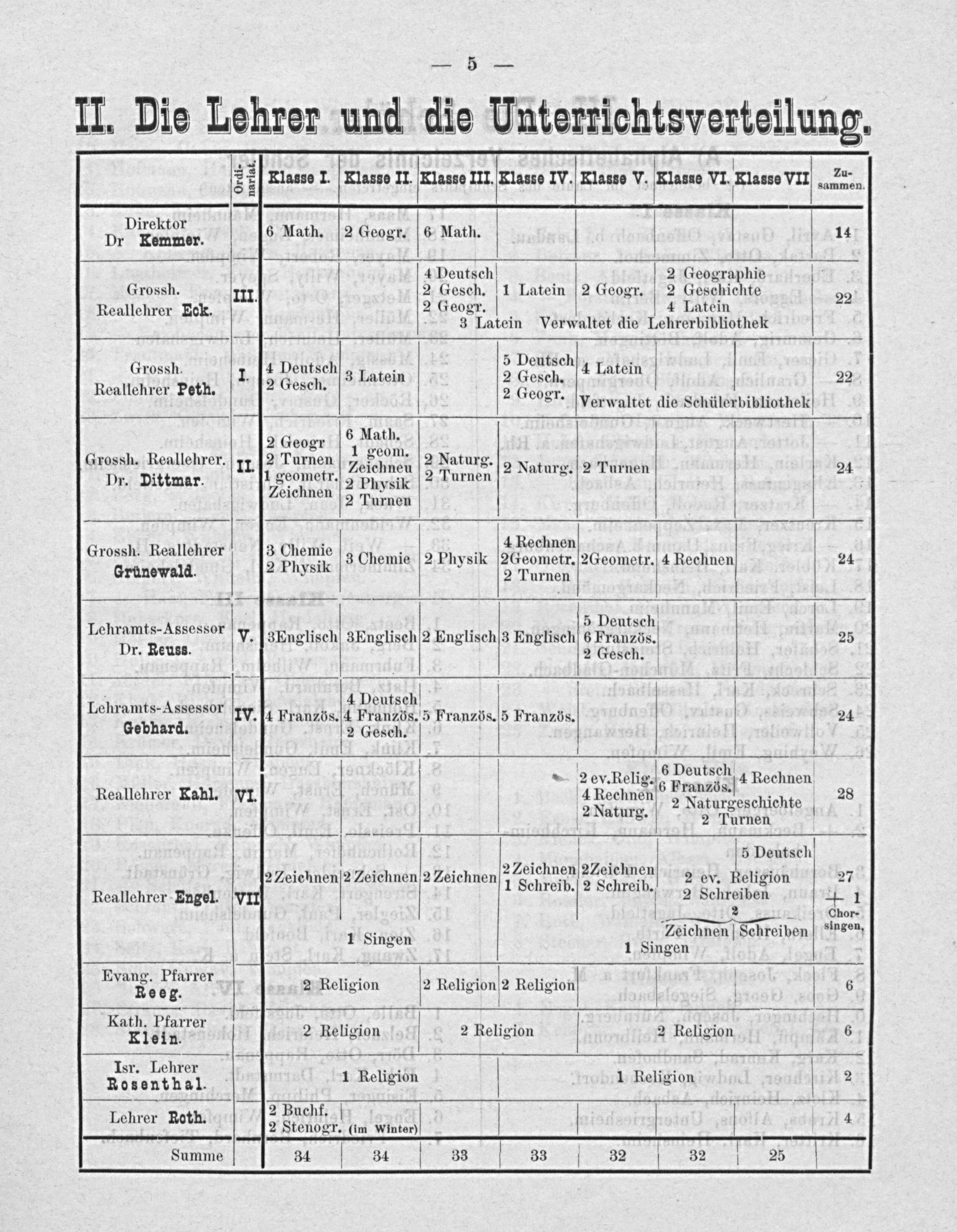 242 5 ½ Klasse I. Klasse II. Klasse III. Klasse IV. Klasse V. Klasae Nr Tlasss VII Tuen 8 Direktor 2 Dr Kemmer. 6 Math. 2 Geogr. 6 Math. 14 4 Deutsch 2 Geographie Grossh. III 2 Gesch. 1 Latein 2 Geogr. 2 Geschichte 22 Reallehrer Eck. 2 Geogr. 4 Latein callenrr 3 Latein Verwaltet die Lehrerbibliothek Iross 8 5 Deutsch. R nneend th 1. 4 Heutich 3 Latein 2 Gesch. 4 Latein 22 eallehrer Peth.. 39. Sallenter 2 Geogr. verwaltet die Schülerbibliothek Grassh. Roallehrer. 11. 2 Tarnen Zeichneu 3 Naturg. 2 Naturg. 2 Turnen 24 Dr. Dittmar. Fomne r. 2 Physik urnen eichnen 2 Turnen . 2 ℳ. 4 Rechnen Grossh. Reallehrer 3 Chemui 3 Chemie 2 Physik 2 Geometr. 2 Geometr. 4 Rechnen 24 Grünewald. 1S 2 Turnen os 5 Deutsch Lehramts-Assessor V.[3Englisch 3Englisch2 Englisch3 Englisch 6Französ. 25 Dr. Reuss. 2 Gesch. V . 1. 4 Deutsch Lehramts-Assessor IV. ſi Französ. 4 Franzds. 5 Französ. 5 Französ. 24 Gebhard. 2 Gesch. — 2 ev. Relig. 6— 4 Rechnen 5 hrar 2 8.. Reallehrer Kahl. VI. 4 Neehnen 2 Naturgeschichte V 28 aturg. 2 Turnen 5 Deutsch 2 Zeichnenſ2 Zeichnen 2 Zeichnen 2Zeicheen LZeiehnen 2 ev. Religion 27 Reallehrer Engel. VII 1 2 Sehteiben 1 1 Chor- —— 1 Sing Zeichnen Schreiben'insen, incen 1 Singen Evang. Pfarrer„... Reeg. 2 Religion 2 Rellgionſ⸗ Religion 6 Kath. Pfarrer 4— Kiein. 2 Religion V 2 Religion 2 Religion b 6 Isr. Lehrer 4— 0 7 2 Rosenthal. 1 Religion 1 Religion V . 2 Buchf. Lehrer Roth. 2 Stenogr. im Wiaten) V 4 Summe 1.., e
