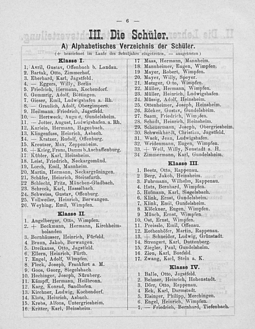 (+ bezeichnet im Laufe des Schuljahrs eingetreten,— ausgetreten) Klasse I. 17 Maas, Hermann, Mannheim. . Avril, Gustav, Offenbach b. Landau. 18. Mannheimer, Eugen, Wimpfen. . Bartak, Otto, Zimmerhof. 19 Mayer, Robert, Wimpfen.
