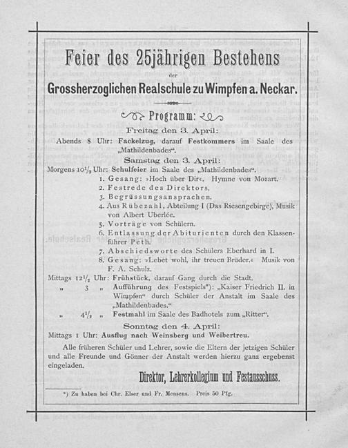 F. A. Schulz. Mittags 12 ½ Uhr: Frühstück, darauf Gang durch die Stadt. „ 3„ Aufführung des Festspiels“*):„Kaiser Friedrich II. in Wimpfen“ durch Schüler der Anstalt im Saale des „Mathildenbades.“ „ 4 ½„ Festmahl im Saale des Badhotels zum„Ritter“.