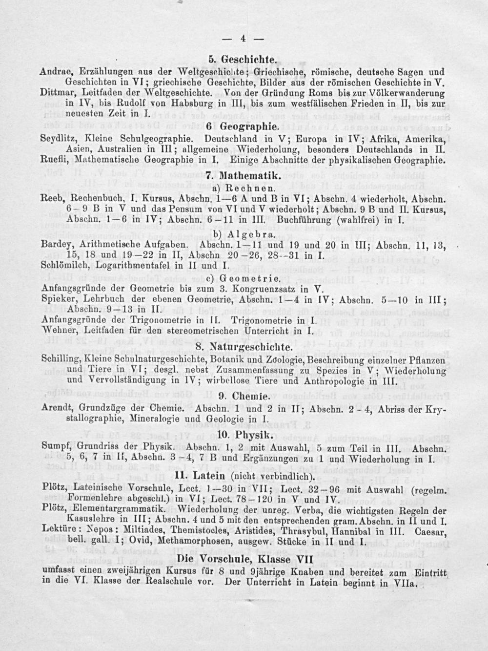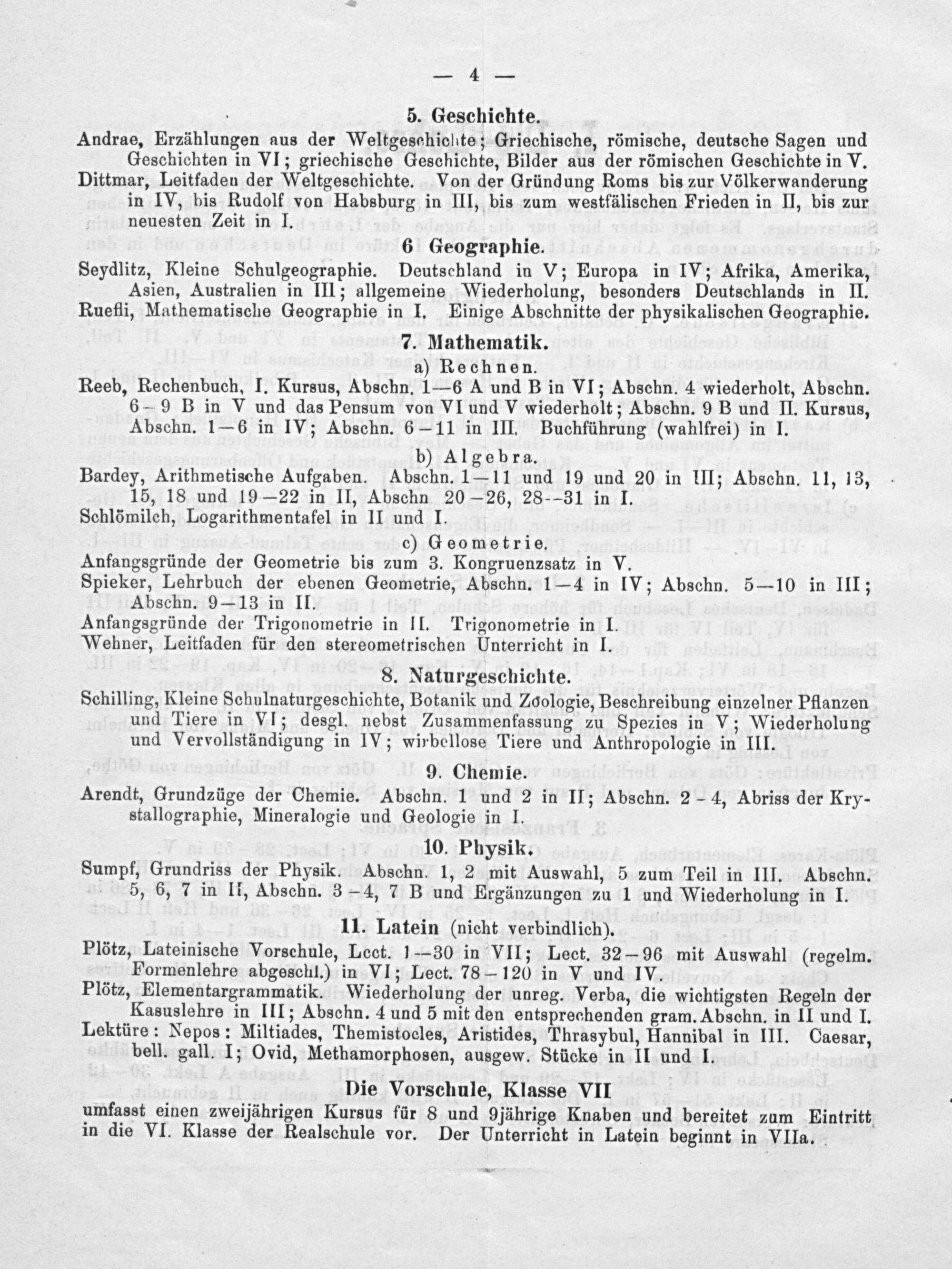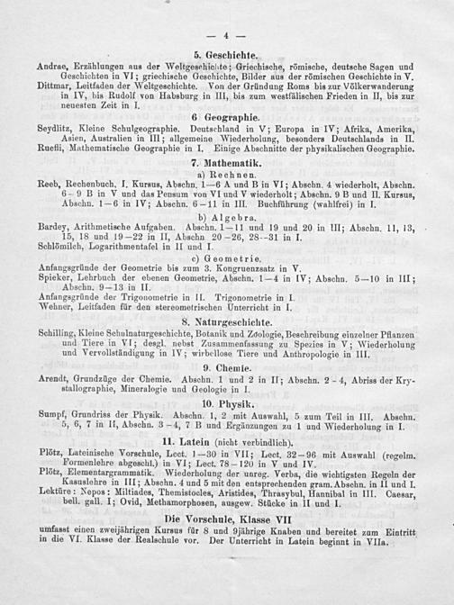 . 5. Geschichte. Andrae, Erzählungen aus der Weltgeschichte; Griechische, römische, deutsche Sagen und Geschichten in VI; griechische Geschichte, Bilder aus der römischen Geschichte in V. Dittmar, Leitfaden der Weltgeschichte. Von der Gründung Roms bis zur Völkerwanderung in IV, bis Rudolf von Habsburg in III, bis zum westfälischen Frieden in II, bis zur neuesten Zeit in I. 6 Geographie. Seydlitz, Kleine Schulgeographie. Deutschland in V; Europa in IV; Afrika, Amerika, Asien, Australien in IIl; allgemeine Wiederholung, besonders Deutschlands in II. Ruefli, Mathematische Geographie in I. Einige Abschnitte der physikalischen Geographie.