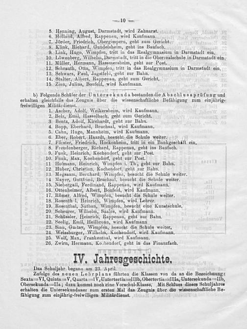 . Sinn, Gustav, Wimpfen, besucht die Schule weiter. Weissburger, Wilhelm, Kochendorf, wird Kaufmann. . Wolf, Max, Frankenthal, wird Kaufmann.