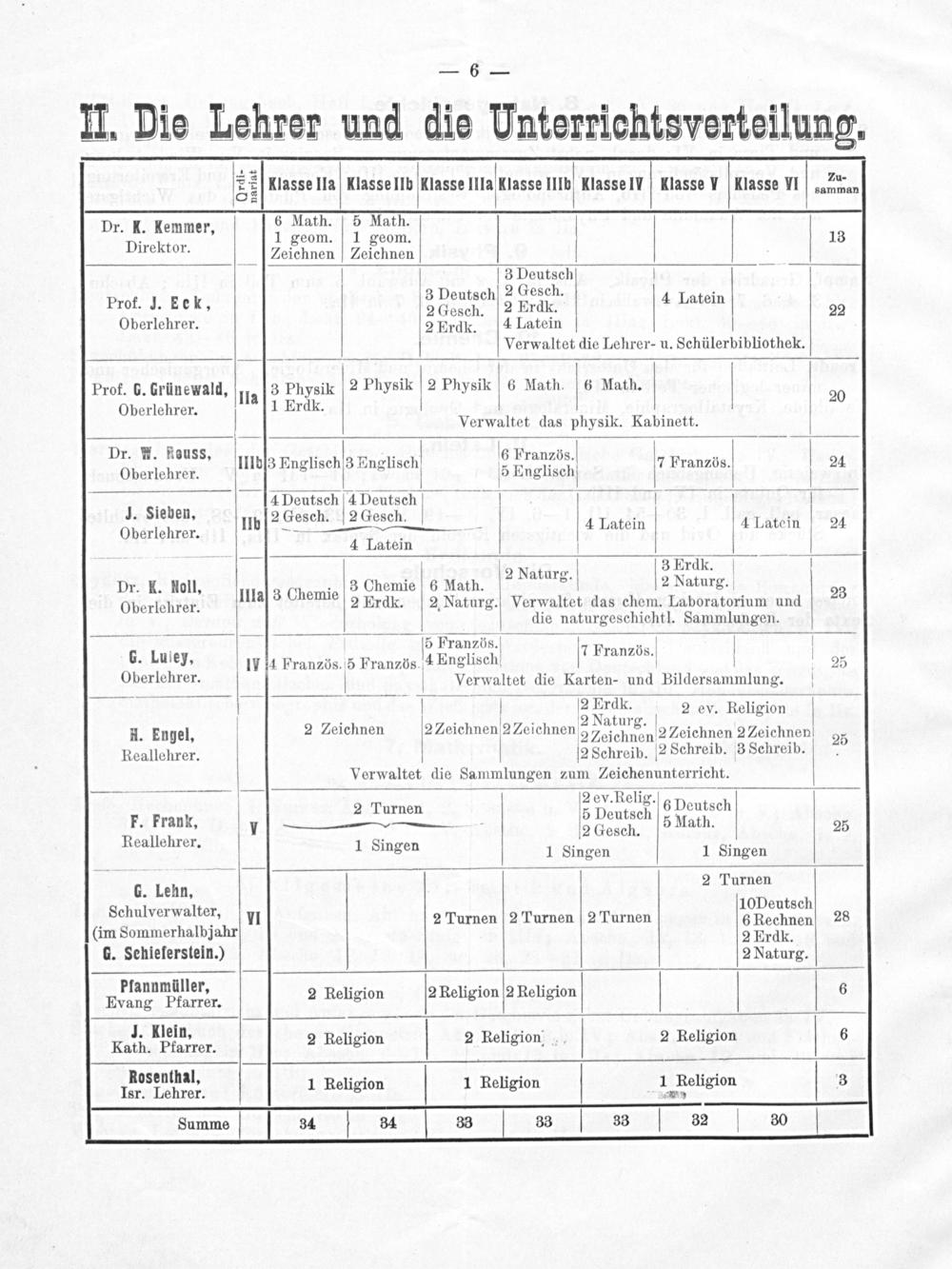 Klasse IIa Klasse llb Klasse 1usnsse un Ilasse II Hlasse I Klasse VYI auran Dr. I. Kemmer 6 Math. 5 Math. Di kt* 1 geom. 1 geom. 13 lrektor. TLeichnen] Zeichnen 3 Deutsch 2 3 Deutsch 2 Gesch. j Prof. J. Eek, 3 Gesch. 2 Erdk. 4 Latein 22 Oberlehrer. 2 Erdk. 4 Latein Verwaltet die Lehrer- u. Schülerbibliothek. Prof. G. Grünewald, 3 Physik 2 Physik 2 Physik 6 Math. 6 Math. 20 Oberlehrer. 1 Erdk. Verwaltet das physik. Kabinett. Dr. f. Reuss,:„. 6 Vranzös.. 5 Oberlehrer. 3 Englisch 3 Englisch 5 Engliseh 7 Französ. 24 J. Sieben 4 Deutsch 4 Deutsch Ordleher 2 Geschee Gesch—e 4 Latein 4 Latein 24 4 Lalain. 3 Erdk. 2 Naturg. 9 Ne nre. Dr L. Holl. ſI,3 Chemie5 Chemie 6 Math 2 Naturs 2 Naturg. 27 Oberlehrer. 2 Erdk. 2, Naturg. Verwaltet das chem. Laboratorium und die naturgeschichtl. Sammlungen. 5 Französ.— 6. Luſey. 4 Französ. 5 Französ. 4 Englisch rAue V V, 25 Oberlehrer. Verwaltet die Karten- und Bildersammlung. 2 Prdk. 1 2 ev. Religion ; Na urg. H. Engel, 2 Zeichnen 2 Zeichnen 2 Zeichnen 2 Zeichnen 2 Zeichnen 2 Zeichnen 25 Reallehrer. 2 Schreib. 2 Schreib. 3 Schreib. 7 Verwaltet die Sammlungen zum Zalchenunterricht. 2 ev. Relig. de F. Frank 2 Turnen 5 Deutsch 6Peutsch . Fran„[— ⏑⏑—— 2 2p,—— 2 Gesch 5 Math. 25 Reallehrer.. Lallohter 1 Singen 1 Singen 1 Singen 8 G. Lehn 3 2 Turnen Tpordre⸗ 10 Deutsch Schulverwalter, 2 Turnen 2 Turnen 2 Turnen Rechn 28 (im Sommerhalbjahr eRecunen 2 Erdk. G. Sehieferstein.) 2 Naturg. Efaunabilere, 2 Religion S Religion 2 Religion 6 J. Klein, 4„„ Religi 6 Kath. Pfarrer 2 Religion 2 Religion 2 Religion Rosenthal, 1 Religion 1 Religion 1 Religion 3 Isr. Lehrer. n Summe 34 34 3³ 33 33 3² 30