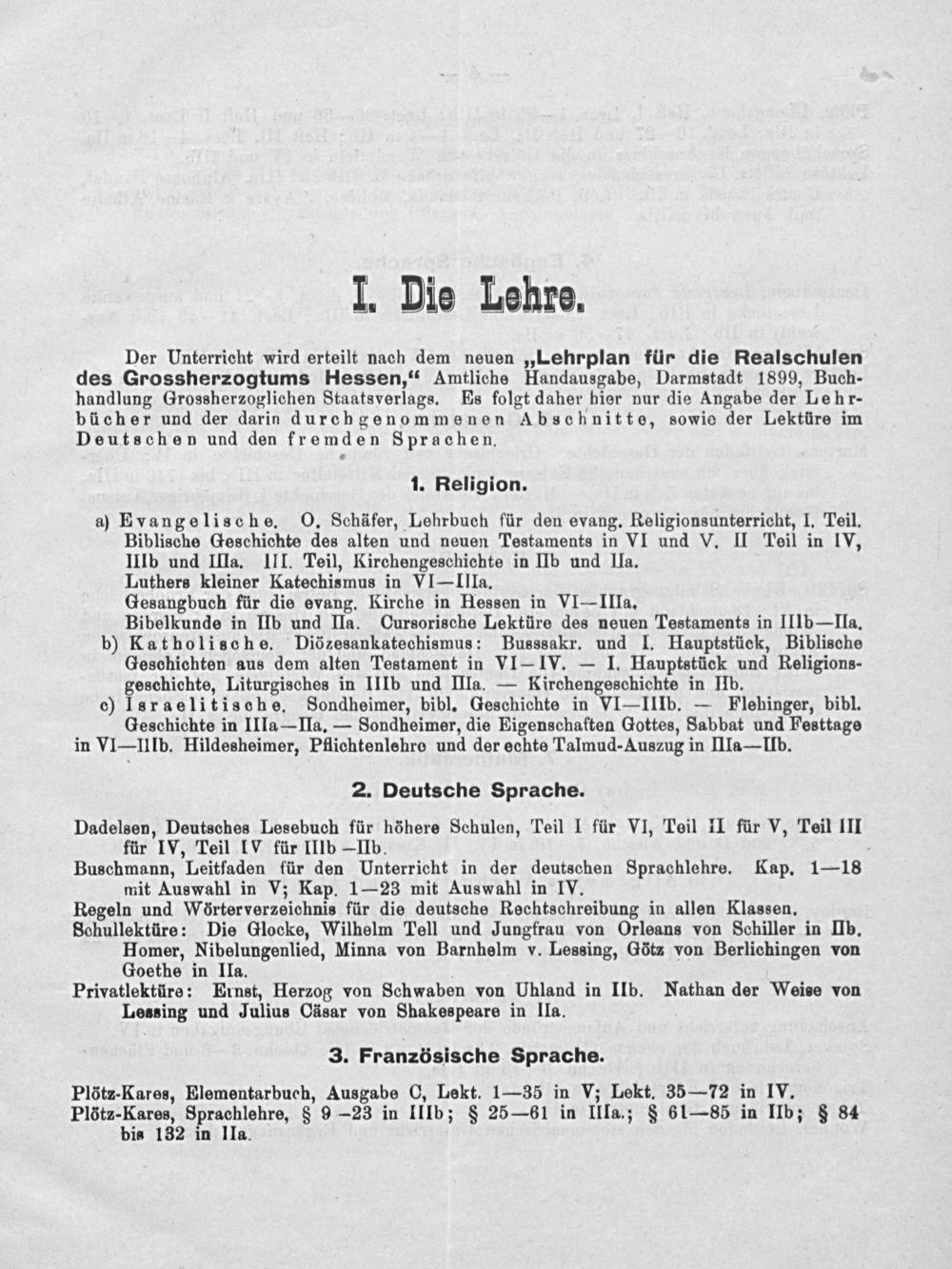Der Unterricht wird erteilt nach dem neuen„Lehrplan für die Realschulen des Grossherzogtums Hessen,“ Amtliche Handausgabe, Darmstadt 1899, Buch- handlung Grossherzoglichen Staatsverlags. Es folgt daher bier nur die Angabe der Lehr- bücher und der darin durchgenommenen Abschnitte, sowie der Lektüre im Deutschen und den fremden Sprachen.