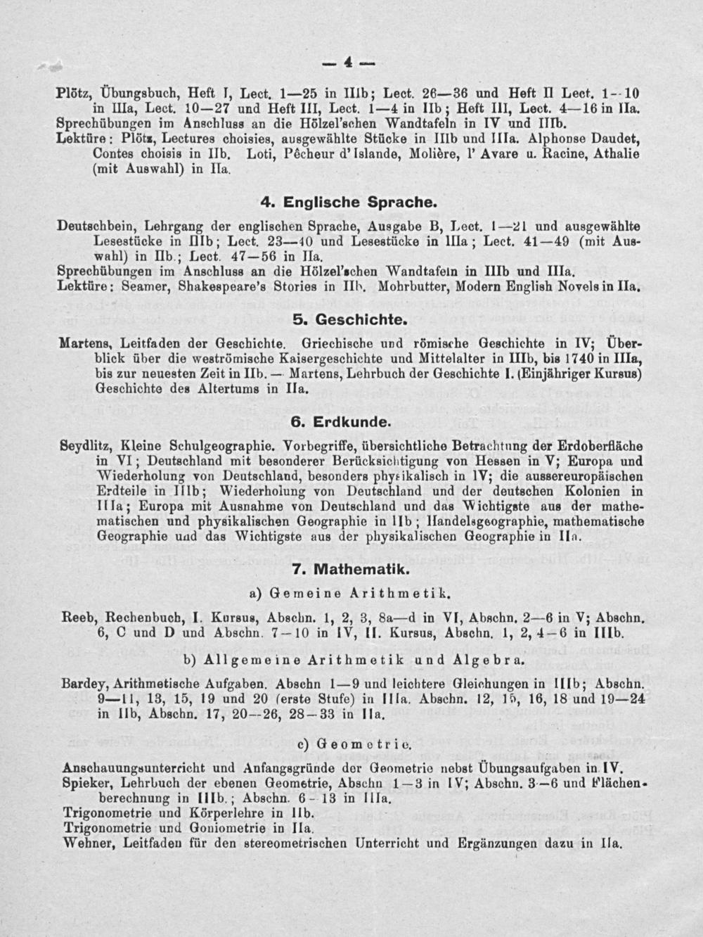 Seydlitz, Kleine Schulgeographie. Vorbegriffe, übersichtliche Betrachtung der Erdoberfläche in VI; Deutschland mit besonderer Berücksichtigung von Hessen in V; Europa und Wiederholung von Deutschlaud, besonders physikalisch in IV; die aussereuropäischen Erdteile in IIIb; Wiederholung von Deutschland und der deutschen Kolonien in IIIa; Europa mit Ausnahme von Deutschland und das Wichtigste aus der mathe- matischen und physikalischen Geographie in IIb; Handelsgeographie, mathematische Geographie uand das Wichtigste aus der physikalischen Geographie in IIa.