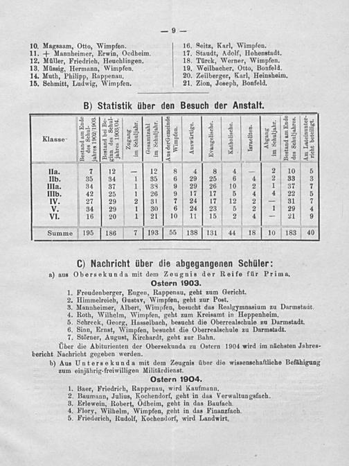 11.+ Mannheimer, Erwin, Oedheim. 17. Staudt, Adolf, Hohenstadt. 12. Müller, Friedrich, Heuchlingen. 18. Türck, Werner, Wimpfen. 13. Müssig, Hermann, Wimpfen. 19. Weilbacher, Otto, Bonfeld. 14. Muth, Philipp, Rappenau. 20. Zeilberger, Karl, Heinsheim. 15. Schmitt, Ludwig, Wimpfen. 21. Zion, Joseph, Bonfeld.