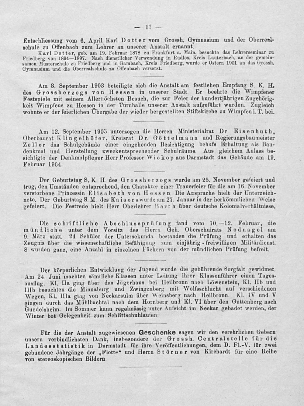 Karl Dotter, geb. am 19. Februar 1878 zu Frankfurt a. Main, besuchte das Lehrerseminar zu Friedberg von 1894— 1897. Nach dienstlicher Verwendung in Rudlos, Kreis Lauterbach, an der gemein- samen Musterschule zu Friedberg und in Gambach, Kreis Friedberg, wurde er Ostern 1901 an das Grossh. Gymnasium und die Oberrealschule zu Offenbach versetzt.