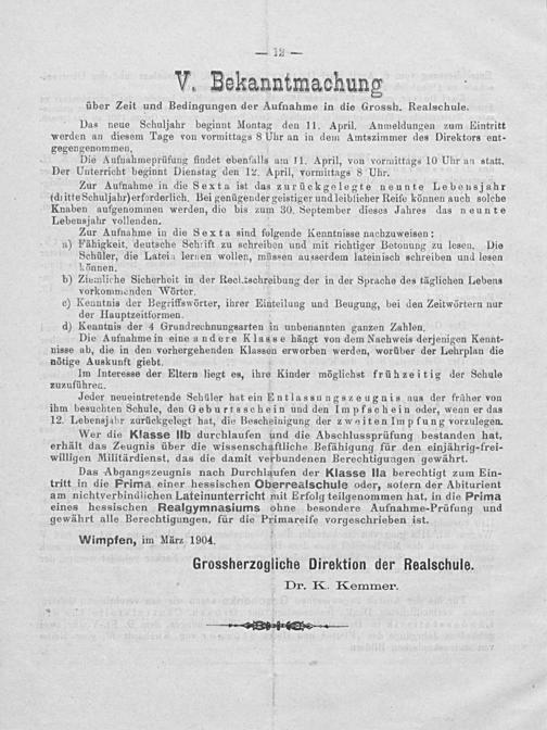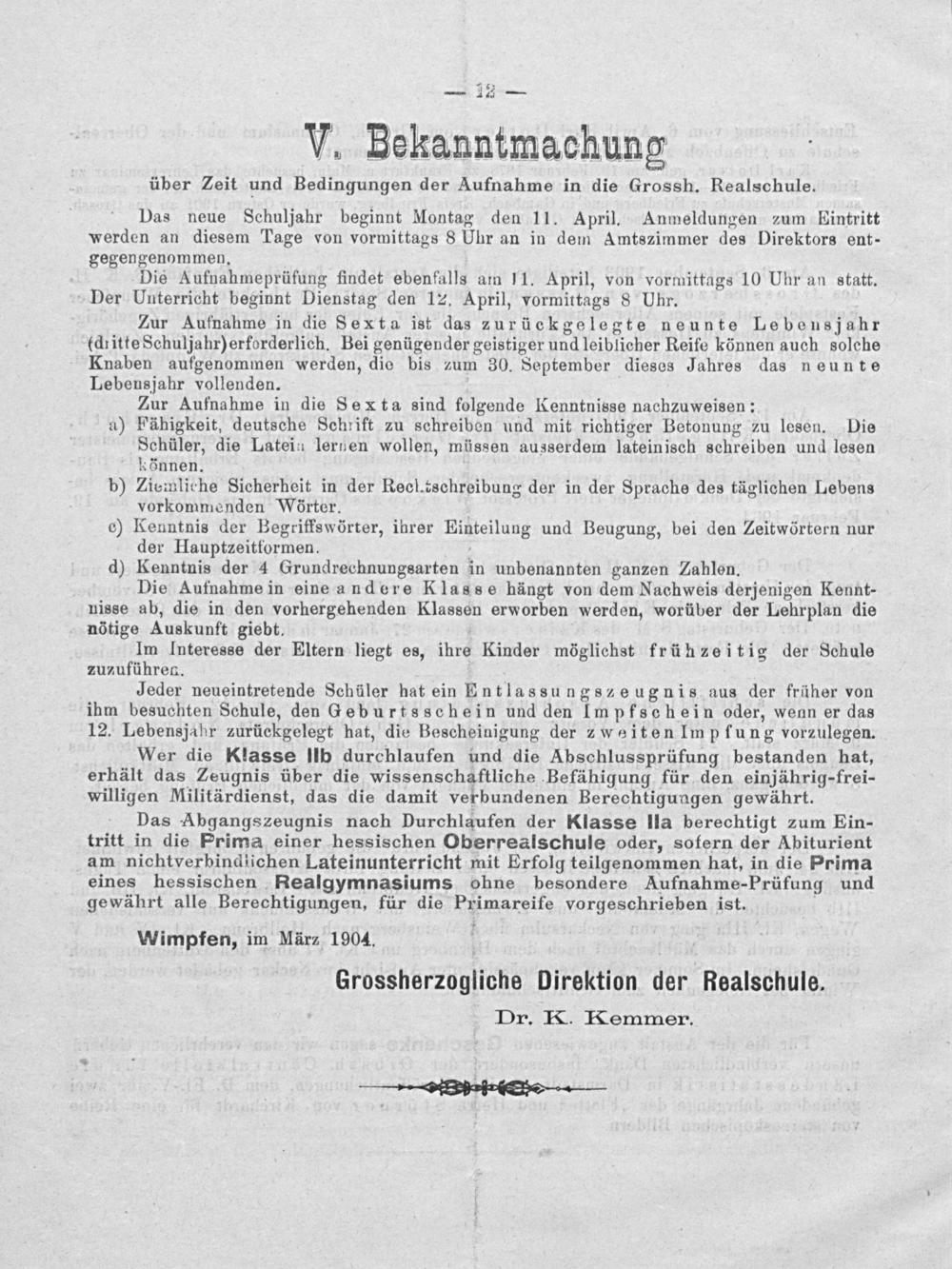 Grossherzogliche Direktion der Realschule. Dr. K. Kemmer.