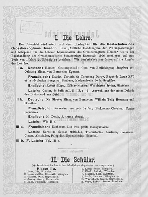 Klasse II a. 6. Klenk, Ernst, Wimpfen. 1. Benz, Jda, Wimpfen.— 7. Klenk, Ludwig, Wimpfen. 2. Ganzenmüller, Elisabeth, Wimpfen. 8. Schöller, Karl, Jagstfeld. 3. Gassert, Otto, Siegelsbach.— 9. Stade, Johanna, Wimpfen.+ 4. Jacoby, Georg, Darmstadt. 10. Wagenbach, Georg, Siegelsbach. 5. Kahn, Friedrich, Wimpfen.— 11. Gepp, Robert, Santos, Brasilien.