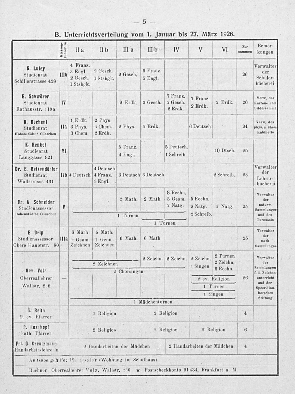4 E Zu- Bemer- 3 a b V Ia V VI.nen Lungen 4 Franz. V lter 6. Luley— erwalten 4 3 E 2 Gesch. 6 Franz.. Studienrat IIlb ngl. 2 Gesch. 26 der Schillerstrasse 428 2 Gesch. 1 Stsbgk. 5 Engl. Schüler- 1 1 Stsbgk. bücherei E. Senwörer 7 Franz. 7 Franz Verw. der Studienrat 11 2 Erdk. 2 Gesch. 2 Gesch. 2 Erdk 2 Erdk. 26 ſKarten- und Rathausstr. 119 a 2 Erdk. Tradk. Bildersamml N. Dechent 1 Erdk. 2 Phys Verw. des Studienrat la 3 Phys. Chem. 2 Phys. 2 Erdk. 6 Deutsch 24„phys. u chem Hohenstädter Gisschen 3 Chem 2 Erdk. Kabinettse 1. Uenkel 5 Franz. 5 Deutsch. Studienrat VI 4 Engl 1 Schrei 10 Dtsch. 25 Langgasse 321 ngl. Schreib Dr. E. Betzendörfer 4 Deufsch Verwalter Studienrat IIb4 Deutsch 4 Franz. 3 Deutsch 3 Deutsch 2 Schreib. 23 1 er 4 9 ehrer- Walls rasse 4831136 3 Engl. bücherei 3 Rechn. Rech Verwalter „ 5 3 G. Dr. 1 Sehreider 2 Math. 2 Math 8 Sednn 5 Rechn 11e, Studienassessor 1 atg. 2 Natg. 2 Natg. 25 Sammlungen Hohenstüdter Gisschen 1 Turnen 2 Schreib. und des T Turnen Turnsaals E Delp 6 Math 5 Math. Verwalter Studienassessor llla Geom. 1 Geom 6 Math. 6 Math. 25 1n Obere Hauptstr. 80 Zeichnen Zeichnen Sammlunger 2 Zeichn. 2 Zeichn. 2 Zeichn. 2 Türnen Vorwalter 2 Zeichnen 1 Singen 2 Zeichn. der Hen. vol⸗— Sing 6 Rechn. sammlungen 1 2 norsingen f. d. Zeichen- Oberreallehrer— 2 ev. Religion 26 anterrieht nd der Wallstr. 2.96 1 Turnen e ds 1 Singen berschen 4 stift 1 Mädchenturnen ung 6. Reith 35„ R ia 2 g 2 Re 2 ev. Pfarrer Religion eligion 4 P. bos kopl 10„ e 69 ligion 2 R T 2 g kath Pfarrer 2 Religio eligion Religion 6 Prl. b. Kreutamann 2 Handarbeiten 2 Handarbeiten der Mädchen 4