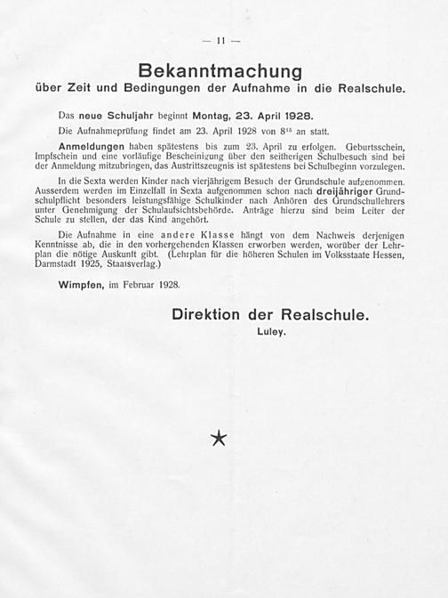 Das neue Schuljahr beginnt Montag, 23. April 1928. Die Aufnahmeprüfung findet am 23. April 1928 von 8 ¹⁵ an statt.