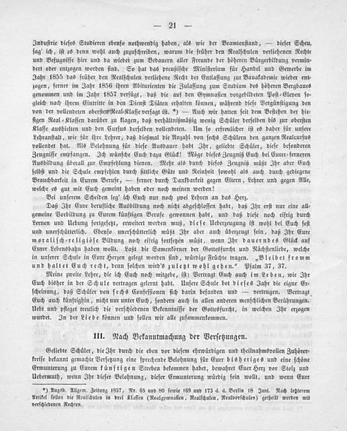 Induſtrie dieſes Studieren ebenſo nothwendig haben, als wie der Beamtenſtand,— dieſer Scheu, ſag' ich, iſt es denn wohl auch zuzuſchreiben, warum die früher den Realſchulen verliehenen Rechte und Befugniſſe hier und da wieder zum Bedauern aller Freunde der höheren Bürgerbildung vermin⸗ dert oder entzogen worden ſind. So hat das preußiſche Miniſterium für Handel und Gewerbe im Jahr 1855 das früher den Realſchulen verliehene Recht der Entlaſſung zur Bauakademie wieder ent⸗ zogen, ferner im Jahr 1856 ihren Abiturienten die Zulaſſung zum Studium des höheren Bergbaues genommen und im Jahr 1857 verfügt, daß die auf den Gymnaſien vorgebildeten Poſt⸗Eleven ſo⸗ gleich nach ihrem Eintritte in den Dienſt Diäten erhalten können, während dieſe Vergünſtigung den von der vollendeten oberſten Real⸗Klaſſe verſagt iſt.*)— Auch wir hatten ſeit dem Beſtehen der hie⸗ ſigen Real⸗Klaſſen darüber zu klagen, daß verhältnißmäßig wenig Schüler derſelben bis zur oberſten Klaſſe aushielten und den Curſus derſelben vollendeten. Um ſo erfreulicher iſt es daher für unſere Lehranſtalt, wie für ihre Lehrer, daß dießmal die Anzahl von ſechs Schülern den ganzen Realcurſus vollendet hat. Als Belohnung für dieſe Ausdauer habt Ihr, geliebte Schüler, dieſe beſonderen Zeugniſſe empfangen. Ich wünſche Euch dazu Gluück! Möge dieſes Zeugniß Euch bei Eurer ferneren Ausbildung überall zur Empfehlung dienen. Mehr als durch dieſes Zeugniß müßt Ihr aber Euch ſelbſt und die Schule empfehlen durch ſittliche Güte und Reinheit ſowohl als auch durch gediegene Brauchbarkeit in Eurem Berufe,— ferner durch Dankbarkeit gegen Eltern, Lehrer und gegen Alle, welche es gut mit Euch gemeint haben oder noch meinen werden!