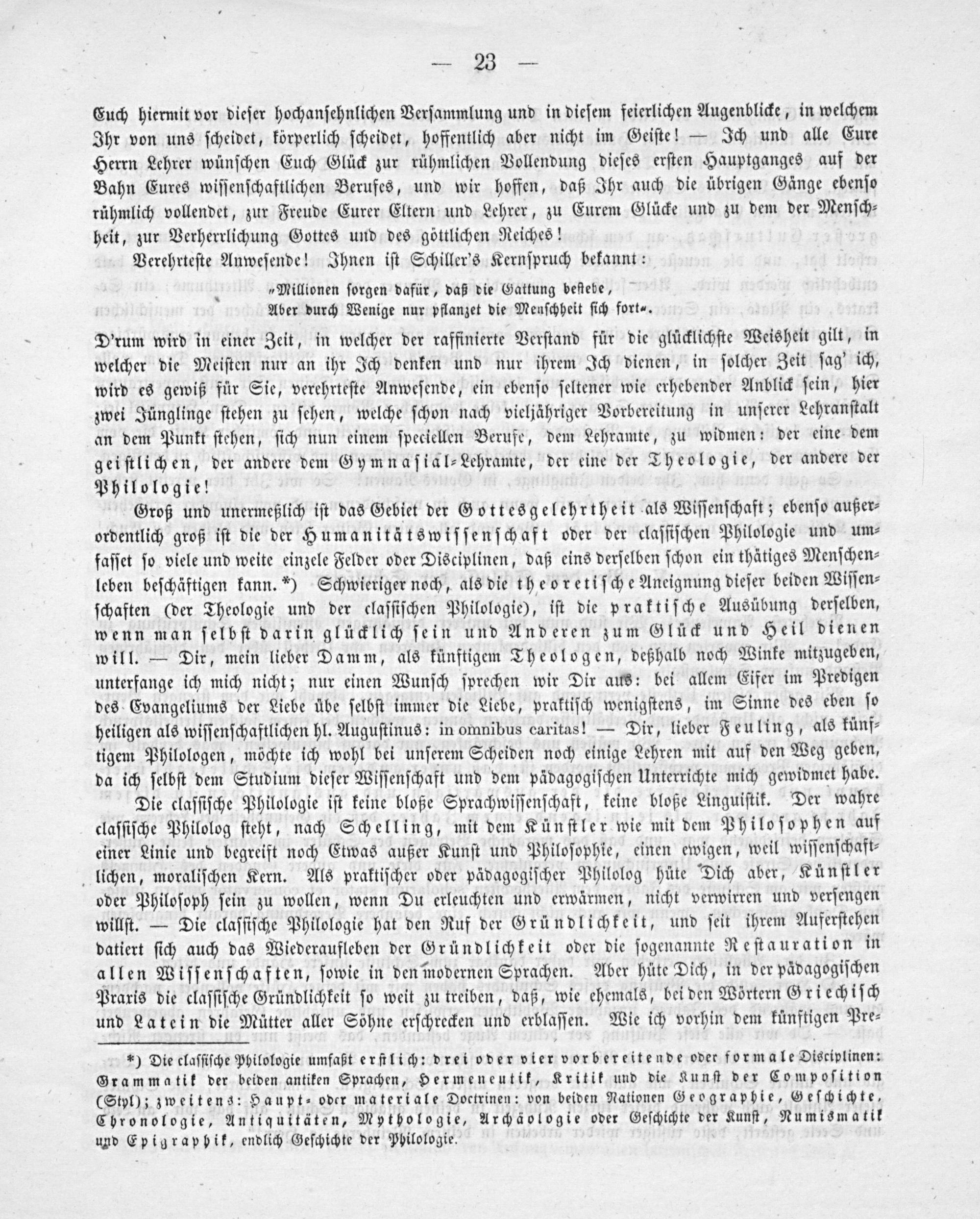 Groß und unermeßlich iſt das Gebiet der Gottesgelehrtheit als Wiſſenſchaft; ebenſo außer⸗ ordentlich groß iſt die de Humanitätswiſſenſchaft oder der claſſiſchen Philologie und um⸗ faſſet ſo viele und weite einzele Felder oder Disciplinen, daß eins derſelben ſchon ein thätiges Menſchen⸗ leben beſchäftigen kann.*) Schwieriger noch, als die theoretiſche Aneignung dieſer beiden Wiſſen⸗ ſchaften(der Theologie und der claſſiſchen Philologie), iſt die praktiſche Ausübung derſelben, wenn man ſelbſt darin glücklich ſein und Anderen zum Glück und Heil dienen will.— Dir, mein lieber Damm, als künftigem Theologen, deßhalb noch Winke mitzugeben, unterfange ich mich nicht; nur einen Wunſch ſprechen wir Dir aus: bei allem Eifer im Predigen des Evangeliums der Liebe übe ſelbſt immer die Liebe, praktiſch wenigſtens, im Sinne des eben ſo heiligen als wiſſenſchaftlichen hl. Auguſtinus: in omnibus caritas!— Dir, lieber Feuling, als künf⸗ tigem Philologen, möchte ich wohl bei unſerem Scheiden noch einige Lehren mit auf den Weg geben, da ich ſelbſt dem Studium dieſer Wiſſenſchaft und dem pädagogiſchen Unterrichte mich gewidmet habe.