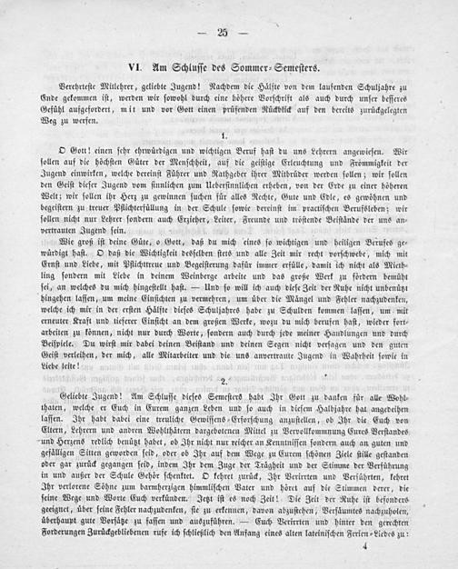 Verehrteſte Mitlehrer, geliebte Jugend! Nachdem die Hälfte von dem laufenden Schuljahre zu Ende gekommen iſt, werden wir ſowohl durch eine höhere Vorſchrift als auch durch unſer beſſeres Gefühl aufgefordert, mit und vor Gott einen prüfenden Rückblick auf den bereits zurückgelegten Weg zu werfen.