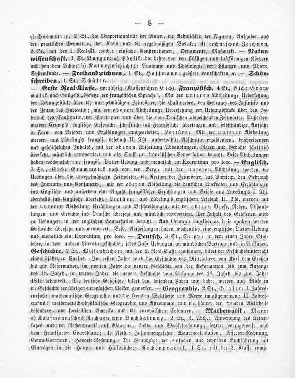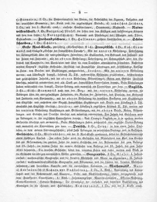 Erſte Real⸗Klaſſe, zweijährig(Klaſſenführer Eich). Franzöſiſch, 4 St., Eich: Gram⸗ matik nach Gnüge's„Geſetze der franzöſiſchen Sprache“. Mit der unteren Abtheilung: Ueberſetzung der Uebungsſtücke über die unregelmäßigen Zeitwörter, die Galliverbes, den Gebrauch des Infinitiv und der Zeiten des Indicativ; mit der oberen Abtheilung;: Ueberſetzung der Uebungsſtücke über den Ge⸗ brauch des Conjunctiv, der Participien und über die vom Deutſchen abweichenden Zeitwörter. Außerdem werden Crump's engliſche Geſpräche ſchriftlich ins Franzöſiſche übertragen und ſelbſtſtändige Aufſätze in Form von Briefen und Erzählungen ausgearbeitet. Lectüre: Mit der unteren Abtheilung werden aus Lüdeking's franzöſ. Leſebuch II. Thl. auserwählte Abſchnitte erzählenden, beſchreibenden und geſchichtlichen Inhalts, mit der oberen Abtheilung Abhandlungen, Reden und Gedichte ſchriftlich überſetzt, mündlich retrovertiert und als Stoff zur franzöſiſchen Converſation benutzt. Beide Abtheilungen haben wöchentlich eine franzöſ. Dictier⸗Uebung und monatlich ein Exercitium pro loco.— Engliſch, 3 St., Eich: Grammatik nach van den Berg: mit der unteren Abtheilung werden die Uebungen über die unregelmäßigen Zeitwörter, die Rection der Zeitwörter, das Particip, den Gebrauch des Indicativ und Conjunctiv, mit der oberen Abtheilung die deutſchen Anekdoten und Erzählungen ins Engliſche und außerdem eine Anzahl franzöſiſcher Erzählungen und Briefe aus Lüdeking's I. Thl. ebenfalls ins Engliſche überſetzt. Lectüre: aus Lüdeking's engliſchem Leſebuch II. Thl. werden mit der unteren Abtheilung Erzählungen und Beſchreibungen, mit der oberen Briefe, Reden, Abhand⸗ lungen und Gedichte ins Deutſche überſetzt und mündlich retrovertiert. Der Inhalt des Geleſenen wird zu Uebungen in der engliſchen Converſation benutzt. Aus Crump's English as it is spoken werden Geſpräche überſetzt und memoriert. Beide Abtheilungen haben wöchentlich eine engliſche Dictier⸗Uebung und monatlich ein Exercitium pro loco.— Deutſch, 3 St., Seipp: in dem einen Jahre Styl⸗ lehre, in dem andern Literaturgeſchichte; jedes Jahr Uebungen im mündlichen Vortrage und in Aufſätzen. Geſchichte, 2 St., Willenbücher: mit der 2. Real⸗Klaſſe combiniert, bildet der Geſchichtsunterricht einen Zjährigen Curſus. Im erſten Jahre wird die Geſchichte des Mittelalters von Karl dem Großen bis zur Reformation, im zweiten Jahre die neuere Geſchichte von der Reformation bis zum Anfange des 18. Jahrh., im dritten Jahre die neuere Geſchichte vom Anfange des 18. Jahrh. bis zum Jahre 1815 behandelt. Die deutſche Geſchichte bildet den leitenden Faden und dabei werden auch Blicke in die Geſchichte der übrigen europäiſchen Völker geworfen.— Geographie, 2 St., Glaſer: I. Jahres⸗ curſus: mathematiſche Geographie und die fremden Welttheile und Meere im allgemeinen; II. Jahres⸗ curſus: mathematiſch⸗phyſikaliſche Geographie und Aſtronomie und die Länder der fremden Welttheile beſonders, am ſpeciellſten Amerika und die europäiſchen Colonieen.— Mathematik, Marr: a) Kaufmänniſches Rechnen und Buchhaltung, 2 St., 2. Abth.: Anwendung des Ketten⸗ ſatzes und der Rechenpractik auf Waaren⸗, Geld⸗ und Wechſelrechnung; letztere vorzugsweiſe nach dem Frankfurter Coursblatte; 1. Abth.: Zuſammengeſetzte Waarencalculation, Effecten⸗Rechnung, Conto⸗Correnten, Havarie⸗Rechnung. Die Grundzüge der einfachen und doppelten Buchführung mit Einträgen in die Haupt⸗ und Hülfsbücher; Rechenpractik, 1 St., mit der 2. Klaſſe comb.