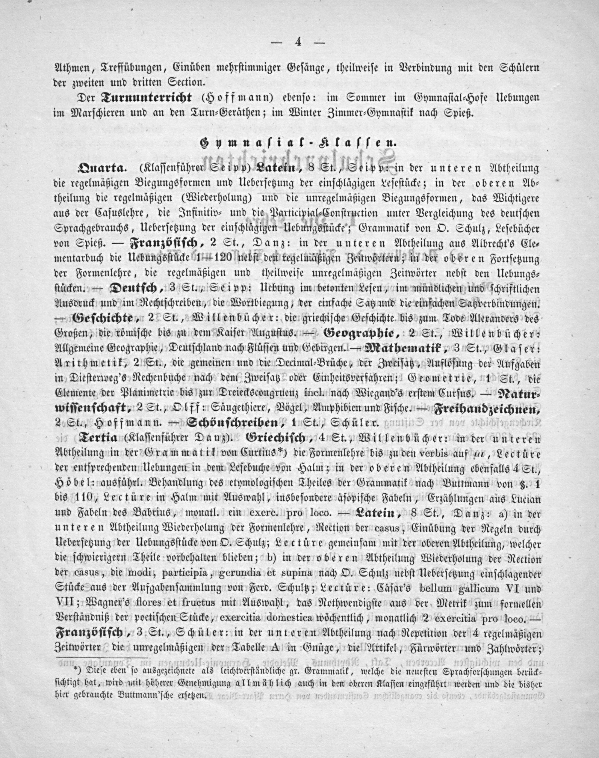 Tertia(Klaſſenführer Danz). Griechiſch, 4 St., Willenbücher: in der unteren Abtheilung in der Grammatik von Curtius*) die Formenlehre bis zu den verbis auf, Lectüre der entſprechenden Uebungen in dem Leſebuche von Halm; in der oberen Abtheilung ebenfalls 4 St., Höbel: ausführl. Behandlung des etymologiſchen Theiles der Grammatik nach Buttmann von§. 1 bis 110, Lectüre in Halm mit Auswahl, insbeſondere äſopiſche Fabeln, Erzählungen aus Lucian und Fabeln des Babrius, monatl. ein exerc. pro loco.— Latein, 8 St., Danz: a) in der unteren Abtheilung Wiederholung der Formenlehre, Rection der casus, Einübung der Regeln durch Ueberſetzung der Uebungsſtücke von O. Schulz; Lectüre gemeinſam mit der oberen Abtheilung, welcher die ſchwierigern Theile vorbehalten blieben; b) in der oberen Abtheilung Wiederholung der Rection der casus, die modi, participia, gerundia et supina nach O. Schulz nebſt Ueberſetzung einſchlagender Stücke aus der Aufgabenſammlung von Ferd. Schultz; Lectüre: Cäſar's bellum gallicum VI und VII; Wagner's flores et fructus mit Auswahl, das Nothwendigſte aus der Metrik zum formeellen Verſtändniß der poetiſchen Stücke, exercitia domestica wöchentlich, monatlich 2 exercitia pro loco.— Franzöſiſch, 3 St., Schüler: in der unteren Abtheilung nach Repetition der 4 regelmäßigen Zeitwörter die unregelmäßigen der Tabelle A in Gnüge, die Artikel, Fürwörter und Zahlwörter;