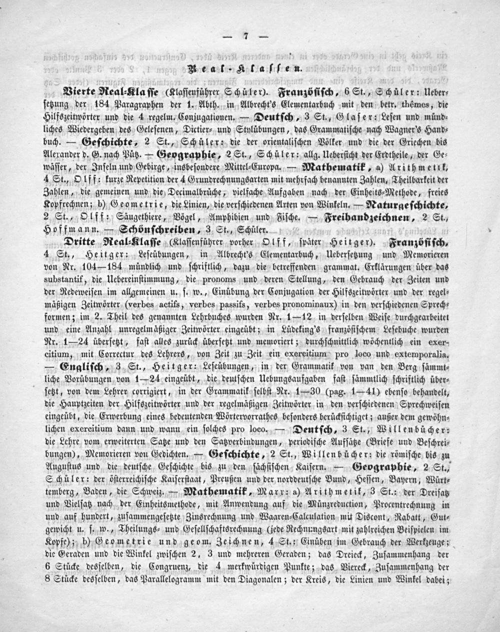 Vierte Real⸗Kla ſſe(Klaſſenführer Schüler). Franzöſiſch, 6 St., Schüler: Ueber⸗ ſetzung der 184 Paragraphen der 1. Abth. in Albrecht's Elementarbuch mit den betr. thémes, die Hilfszeitwörter und die 4 regelm. Conjugationen.— Deutſch, 3 St., Glaſer: Leſen und münd⸗ liches Wiedergeben des Geleſenen, Dictier⸗ und Stylübungen, das Grammatiſche nach Wagner's Hand⸗ buch.— Geſchichte, 2 St., Schüler: die der orientaliſchen Völker und die der Griechen bis Alexander d. G. nach Pütz.— Geographie, 2 St., Schüler: allg. Ueberſicht der Erdtheile, der Ge⸗ wäſſer, der Inſeln und Gebirge, insbeſondere Mittel⸗Europa.— Mathematik, a) Arithmetik, 4 St., Olff: kurze Repetition der 4 Grundrechnungsarten mit mehrfach benannten Zahlen, Theilbarkeit der Zahlen, die gemeinen und die Decimalbruͤche, vielfache Aufgaben nach der Einheits⸗Methode, freies Kopfrechnen; b) Geometrie, die Linien, die verſchiedenen Arten von Winkeln.— Naturgeſchichte, 2 St., Olff: Säugethiere, Vögel, Amphibien und Fiſche.— Freihandzeichnen, 2 St., Hoffmann.— Schönſchreiben, 3 St., Schüler. Dritte Real⸗Klaſſe(Klaſſenführer vorher Olff, ſpäter Heitger). Franzöſiſch,