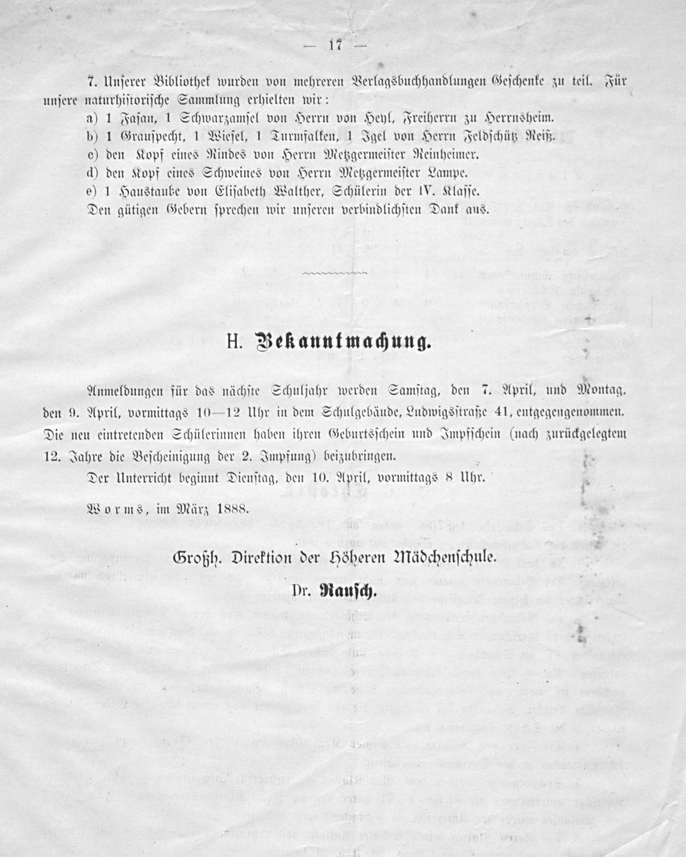 Großh. Direktion der Höheren Mädchenſchule. Dr. Rauſch.
