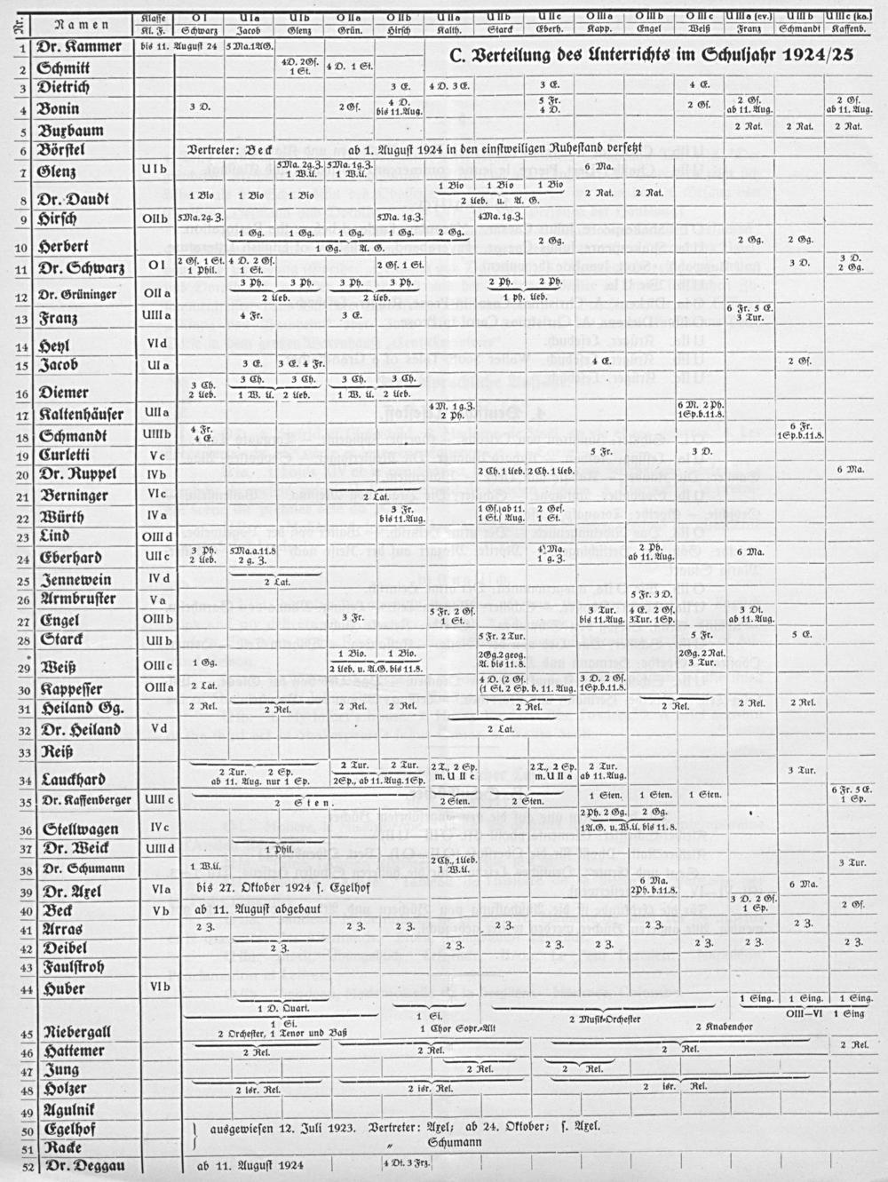 S Namen Faſſe 51 I 3 UI II UI 3me. e e ee i ee 1 8 Kl. F.] Schwarz Jacob Glenz Grün. Hiirſch Kalth. Starck Eberh. Kapp. Engel Weiß Franz Schmandi Kaffenb. 1Dr. Kammer bis 11. Auguſt 24 s MaA. . C. Verteilung des Anterrichts i 2(Schmitt 2 e. 1er Ve g chts im Schuljahr 1924/25 3 Dietrich 3 G. 10. 3. 3 G. 4 G. 4 D. 5 Fr. 2 Gſ. 7 4 Bonin 82. 2 Gſ. ſbis 11. Aiug. 4%. 2 Gſ. ſab 2 eg. 467 1Ng. s Buxrbaum 2 Rat. 2 Nat. 23 Rat. 6 Börſtel Vertreter: Beck ab 1. Auguſt 1924 in den einſtweiligen Ruheſtand verſetzt 2 Glenz 111b 3n d3. cm 3 N. — 1 Blo 1 Bio 1 Bio———— 8 Dr. Daudt 1 Blo 1 Bio 1 Bio. 2 Nat. 2 Nat. 9 Hirſch Ollb SMa.9.3. 5Ma. 19.3. Ma. 19.3. 1 Gg. 1 Gg. 1 Gg. 1 Gg. 2 Sg. 10 Herbert. 2 GCs. 2 Gg8. 2 Gg. 11[Dr. Schwarz Ol A pbi* 166 2 ef1 St V 35. 7. 3 3 Pph. 3 Ph. 3 Ph. 3 Ph. 2 pPh. 2ohohohoho... ð 12 Dr. Grüninger Oll a 2 Lleb. 2 Aeb. 1 ph. Aeb. V 13 Franz dllla 4 Fr. 3G V V* Jr 14 Heyl VId 1s Jacob UI a 3 G. 3 G. 4 Fr. 4. 2 Gf. 3 Ch. 3 Ch. 3 Ch. 3 Ch. . 3 Ch. 16 Diemer 2 deb. 1.5.. 2 Geb. 1. W. d. 2 Aeb. 17 Kaltenhäuſer Ulla 42,393. V ¹Txx, 18 Schmandt unlb a. V ein 19 Curletti Ve s Fr. 3 0. 20 Dr. Ruppel lyb 2 Ch. 1leb. 2 Ch. 1eb. 6 NMa. 21 Berninger VIe— V V ; 3 FNF. 1 Gf.jab 11. 2 Gefſ.— 22 Würth Wa 56611 N. 1299hnn. 1 S. 23 Lind OlII d 24 Eberhard une Th. S2a315 13. u0 11 Nu 6 Nao.— 25 Jennewein WA—. V— 26 Armbruſter Va 5 Fr. 30. 2 F. 3 Tur. 1 G. 2 F.. Dt. 27 Engel Olll b 3 Fr. 2 64 bis 11 Mag. 422., 7E. 4611 Nug. 28 Starck UII b 5 Fr. 2 Tur. 5 Fr. 5 E. . 1 Bio. 1 Bio. 2G2 geog. 29. 2 Nat. 29 Weiß Olllc ¹1 Gg. 2 Leb. u. A. G. bis 11.8. 1. 9es11.3. 3 Tur. — D. Gf. 3 D. 2 Gſ. 30 Kappeſſer Ollla 2 Lat. 4 12 Oh 9. 11. Aug. 2D20. 31 Heiland Gg. 2 Rel. 7 Rel. 2 Rel. 2 Rel.— K 2 7Ro. 2 Rel. 2 Rel. 32 Dr. Heiland Vd 2 Lat. * d—— 33 Reiß V—— 3 2 Tur. 2 Tur. 2 X., 2 Sp. 2 X., 2 Sp. 2 Tur. Tur. Sp.— C—— 4 4 34 Lauckhard 262 uug. 2,7 Sp. ab 11. Aug. 18 p. m. U Il c m. UIl a ſab 11. Aug. V 3 Tur 35 Dr. Kaffenberger Ulll c—7 NJn Sien. 1 Gten. V 1 Sien. 6 FeSoc — V 2 h. 2 Gg. 2 Gg.* 36 Stellwagen Ve 183A.MN 8 11.8. 37 Dr. Weick uma u— V—— 38 Dr. Schumann 1 W. 2Sha11⸗5. 3 Tur 30 Dr. Axel VIa bis 27. Oktober 1924 ſ. Egelhof 29.Nas. 6 Ma. 40 Beck Vb ab 11. Auguſt abgebaut 2 2&,2 eet 41[Arras 2 3. 23. 23 2 3. 2 3. 23. 42 Deibel 2 23 2. 123. 23 23³ 23. 43 Faulſtroh V————— 44 Huber VIb— V 1 ———. 1 Sing. 1 Sing. 1 Sing. — 1 Si. Sm VI 1 Sing ; Si. 2 Muſik⸗Orcheſter 45 Niebergall 2 Orcheſter, 1 Tenor und Baß 1 Chor Sopr.⸗Alt 2 Knabenchor 46 Hattemer 2 Rel. 2 Rel. 2 Rel 2² Rel. 47 Jung V Wei— 48 Holzer Z iar. Rel. 2 18r. Rel. 2 isr. Rel. 490 Agulnik V V V V V V so Egelhof 1 ausgewieſen 12. Juli 1923. Vertreter: Axel; ab 24. Oktober; ſ. Akel. 51[Racke„ Schumann 52] Dr. Deggau ab 11. Auguſt 19224 14 Ot.3 Frz.